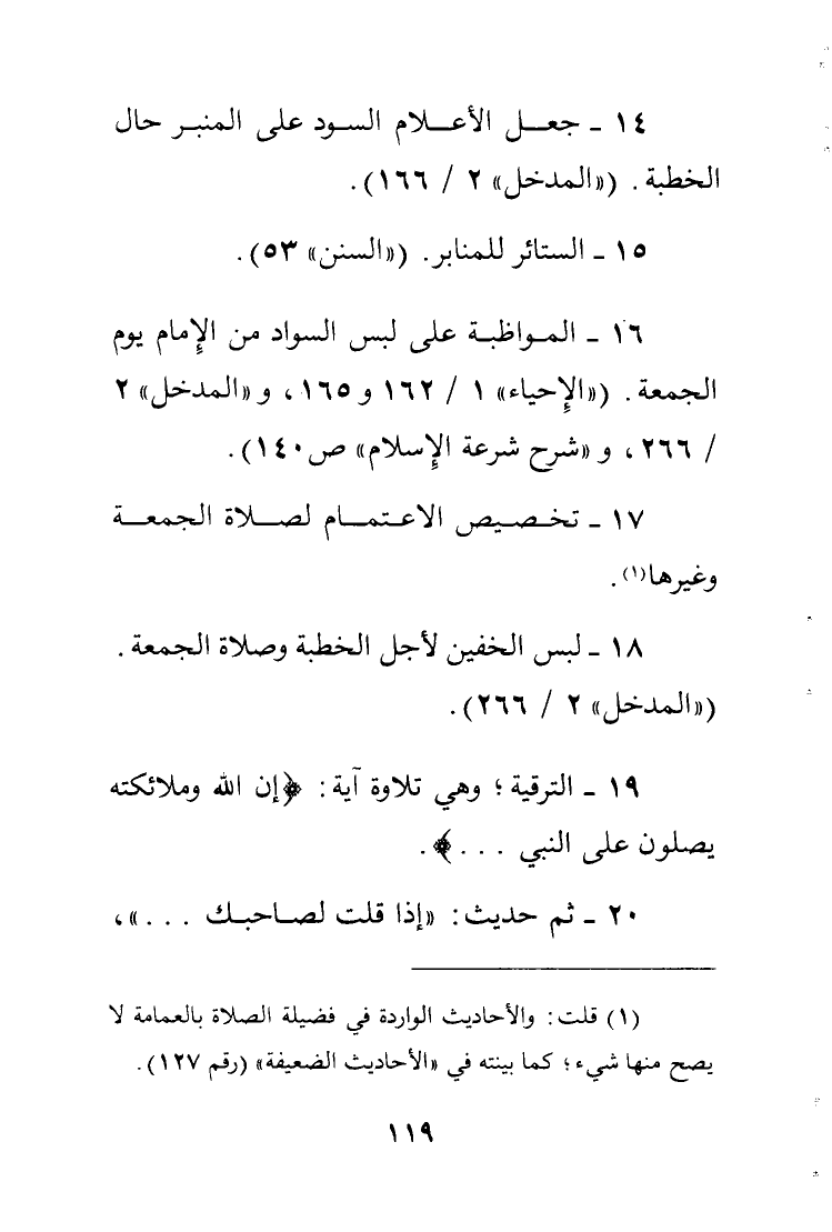 16 - المواظبة على لبس السواد من الإمام يوم الجمعة. ["الإحياء" "1/162 - 165" و"المدخل" "2/266" و"شرح شرعة الإسلام" ص 140]