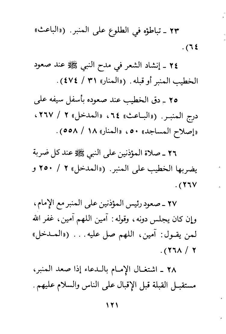 25 - دق الخطيب عند صعوده بأسفل سيفه على درج المنبر. ""الباعث" 64 "المدخل" 2/267 "إصلاح المساجد" 48 طبعتنا "المنار" 18 558"