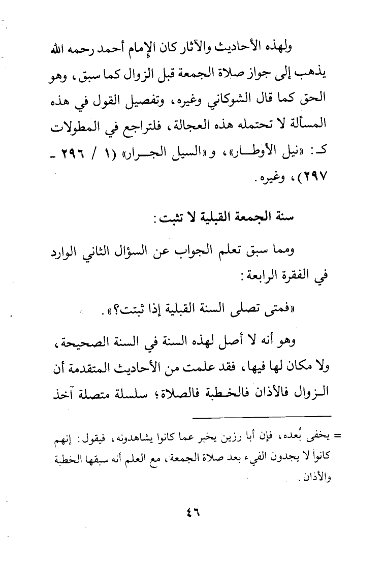 ولهذه الأحاديث والآثار كان الإمام أحمد رحمه الله يذهب إلى جواز صلاة الجمعة قبل الزوال كما سبق وهو الحق كما قال الشوكاني وغيره وتفصيل القول في هذه المسألة لا تحتمله هذه العجالة فلتراجع في المطولات ك "نيل الأوطار" والسيل الجرار 1/296 – 297 وغيره