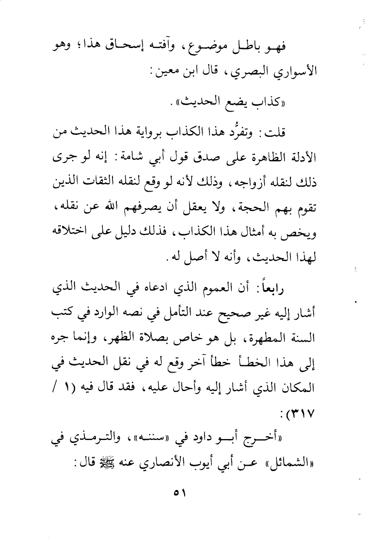 رابعا: أن العموم الذي ادعاه في الحديث الذي أشار إليه غير صحيح عند التأمل في نصه الوارد في كتب السنة المطهرة بل هو خاص بصلاة الظهر وإنما جره إلى هذا الخطأ خطأ آخر وقع له في نقل الحديث في المكان الذي أشار إليه وأحال عليه فقد قال فيه "1/317":