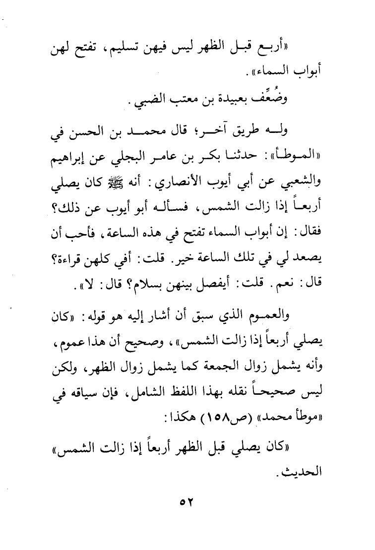والعموم الذي سبق أن أشار إليه هو قوله: "كان يصلي أربعا إذا زالت الشمس" وصحيح أن هذا عموم وأنه يشمل زوال الجمعة كما يشمل زوال الظهر. ولكن ليس صحيحا نقله بهذا اللفظ سياقه في موطأ محمد "ص 158" هكذا: