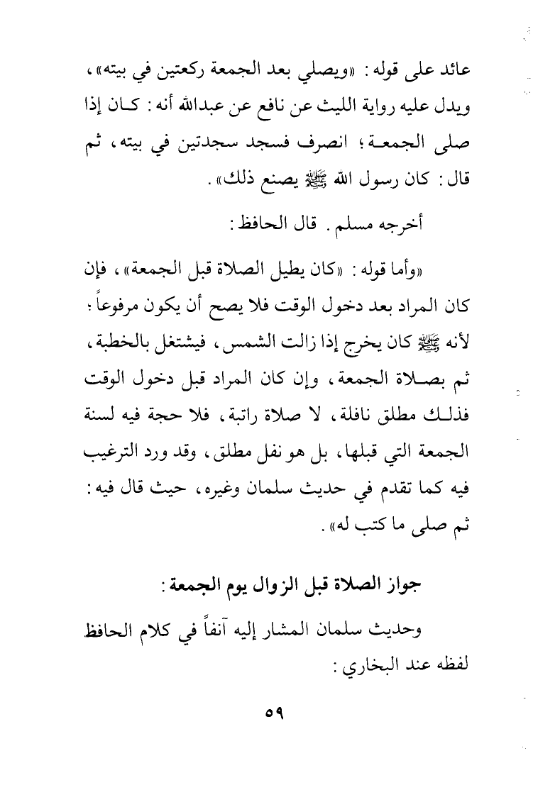 وأما قوله: "كان يطيل الصلاة قبل الجمعة" فإن كان المراد بعد دخول الوقت فلا يصح أن يكون مرفوعا لأنه صلى الله عليه وسلم كان يخرج إذا زالت الشمس فيشتغل بالخطبة ثم بصلاة الجمعة وإن كان المراد قبل دخول الوقت فذلك مطلق نافلة لا صلاة راتبة فلا حجة فيه لسنة الجمعة التي قبلها بل هو نفل مطلق وقد ورد الترغيب فيه كما تقدم في حديث سلمان وغيره حيث قال فيه: ثم صلى ما كتب له"
