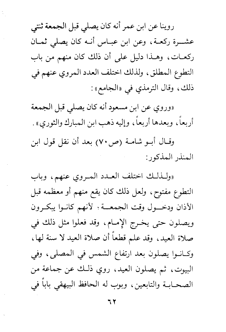 "ولذلك اختلف العدد المروي عنهم وباب التطوع مفتوح ولعل ذلك كان يقع منهم أو معظمه قبل الأذان ودخول وقت الجمعة لأنهم كانوا يبكرون ويصلون حتى يخرج الإمام وقد فعلوا مثل ذلك في صلاة العيد وقد علم قطعا أن صلاة العيد لا سنة لها وكانوا يصلون بعد ارتفاع الشمس في المصلى وفي البيوت ثم يصلون العيد روى ذلك عن جماعة من الصحابة والتابعين وبوب له الحافظ البيهقي بابا في