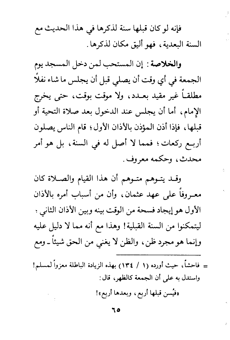 وقد يتوهم متوهم أن هذا القيام والصلاة كان معروفا على عهد عثمان وأن من أسباب أمره بالأذان الأول هو إيجاد فسحة من الوقت بينه وبين الأذان الثاني ليتمكنوا من السنة القبلية وهذا مع أنه مما لا دليل عليه وإنما هو مجرد ظن والظن لا يغني من الحق شيئا ومع
