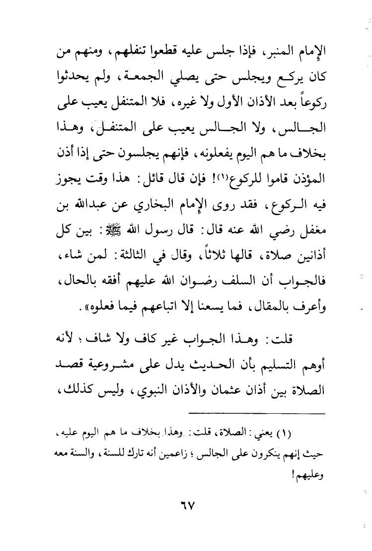 الإمام المنبر فإذا جلس عليه قطعوا تنفلهم ومنهم من كان يركع ويجلس حتى يصلي الجمعة ولم يحدثوا ركوعا بعد الأذان الأول ولا غيره فلا المتنفل يعيب على الجالس ولا الجالس يعيب على المتنفل وهذا بخلاف ما هم اليوم يفعلونه فإنهم يجلسون حتى إذا أذن المؤذن قاموا للركوع1 فإن قال قائل: هذا وقت يجوز فيه الركوع فقد روى البخاري عن عبد الله بن المغفل رضي الله عنه قال: قال رسول الله صلى الله عليه وسلم: "بين كل أذانين صلاة" قالها ثلاثا وقال في الثالثة: "لمن شاء" فالجواب أن السلف رضوان الله عليهم أفقه بالحال وأعرف بالمقال فما يسعنا إلا أتباعهم فيما فعلوه"
