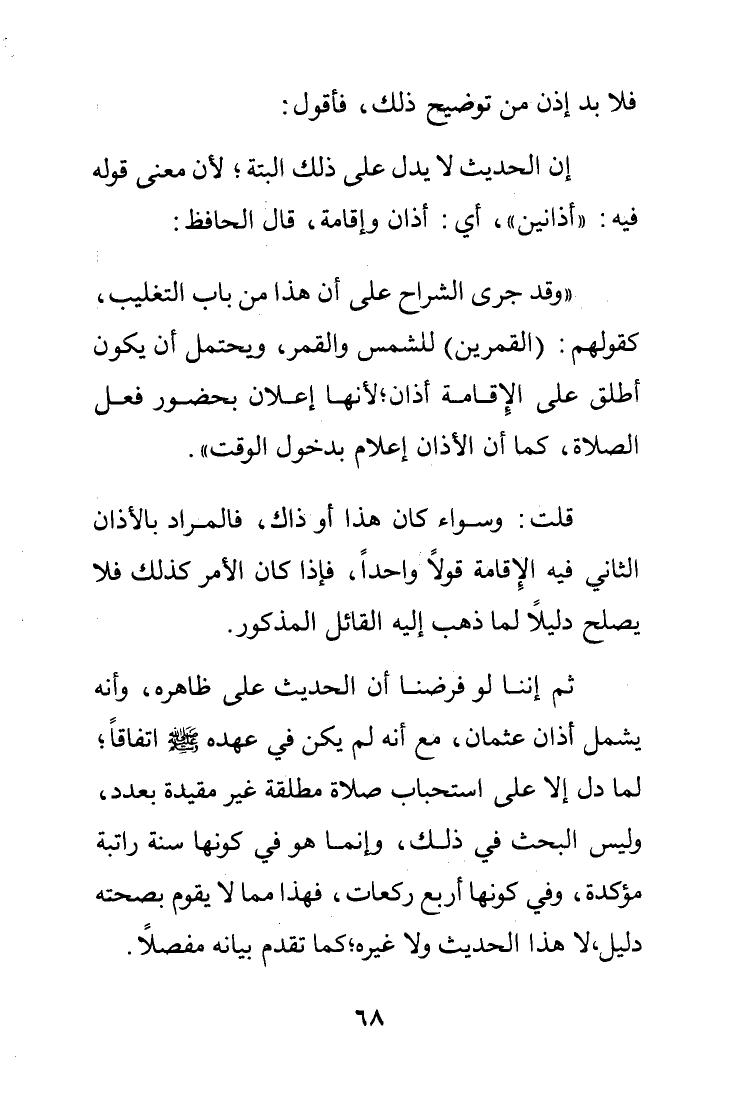 ثم إننا فرضنا أن الحديث على ظاهره وإنه يشمل أذان عثمان مع أنه لم يكن في عهده صلى الله عليه وسلم اتفاقا - لما دل إلا على استحباب صلاة مطلقة غير مقيدة بعدد وليس البحث في ذلك وإنما هو في كونها سنة راتبة مؤكدة وفي كونها أربع ركعات فهذا مما لا يقوم بصحته دليل لا هذا الحديث ولا غيره كما تقدم بيانه مفصلا