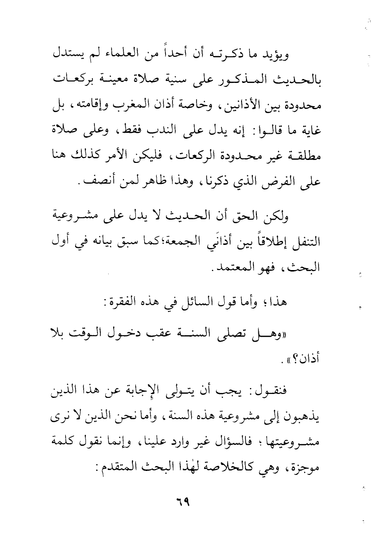 ولكن الحق أن الحديث لا يدل على مشروعية التنفل إطلاقا بين أذاني الجمعة كما سبق بيانه في أول البحث فهو المعتمد