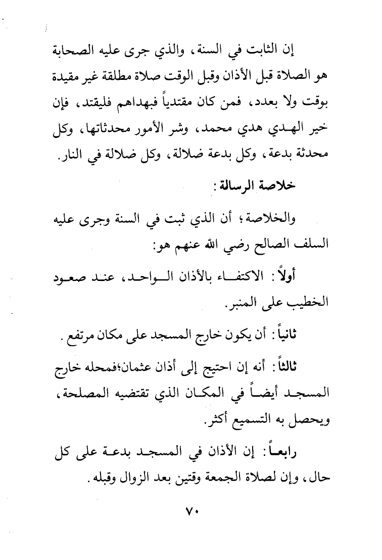 رابعا: أن الأذان في المسجد بدعة على كل حال وأن لصلاة الجمعة وقتين بعد الزوال وقبله.