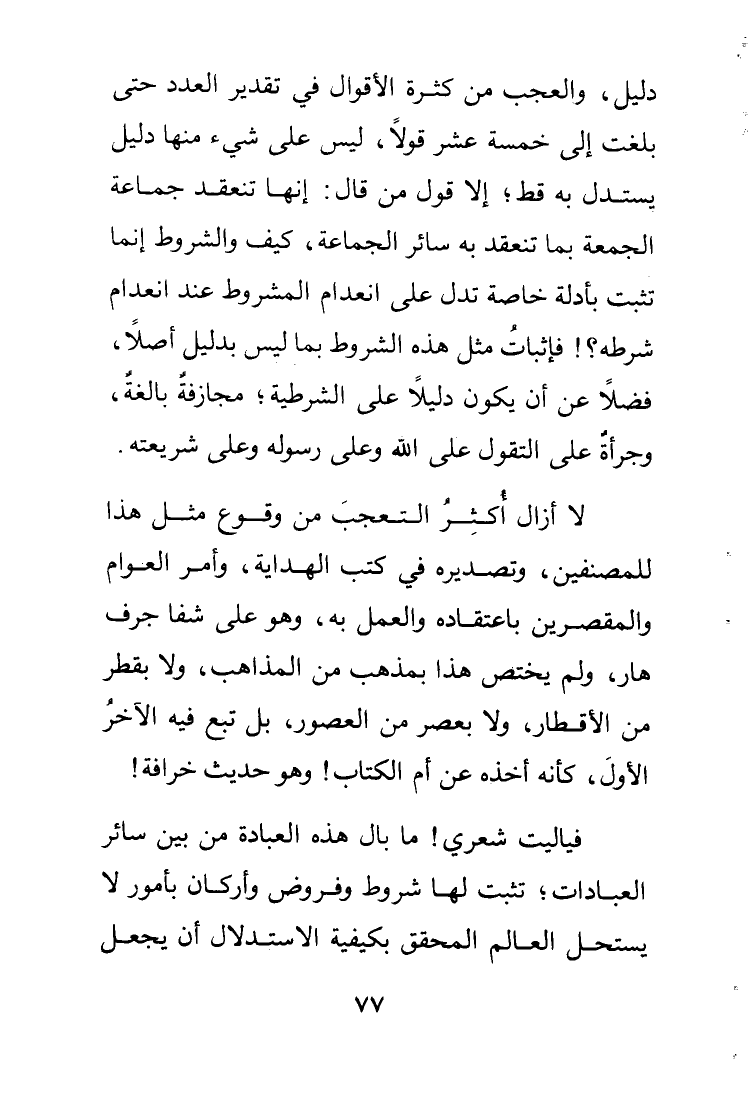 فيا ليت شعري ما بال هذه العبادة من بين العبادات تثبت لها شروط وفروض وأركان بأمور لا يستحل العالم المحقق بكيفية الاستدلال أن يجعل