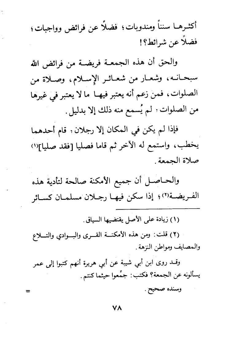 والحاصل أن جميع الأمكنة صالحة لتأدية هذه الفريضة2 إذا سكن فيها رجلان مسلمان كسائر