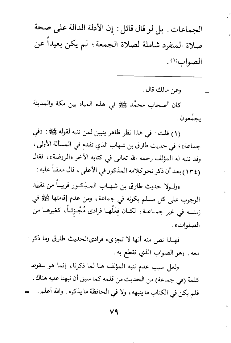 1 قلت في هذا نظر ظاهر يتبين لمن تنبه لقوله صلى الله عليه وسلم: "في جماعة" في حديث طارق بن شهاب الذي تقدم في المسألة الأولى وقد تنبه له المؤلف رحمه تعالى في كتابه الآخر الروضة فقال 134 بعد أن ذكر نحو كلامه المذكور في الأعلى قال معقبا عليه: