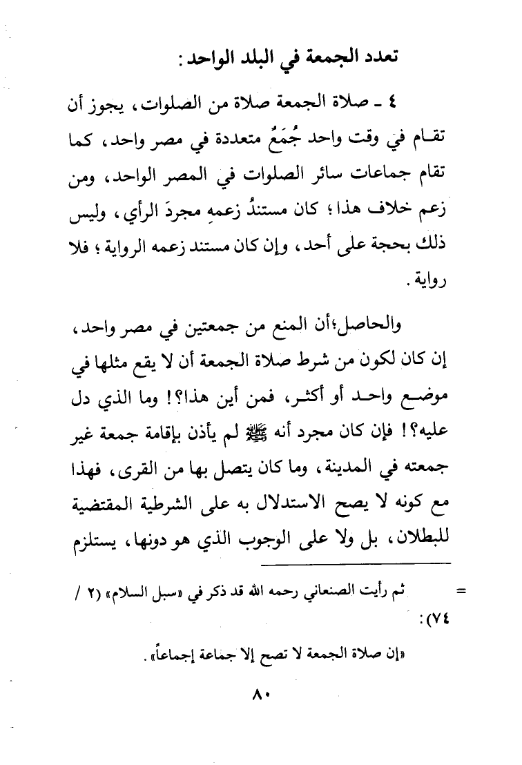 4 - صلاة الجمعة صلاة من الصلوات يجوز أن تقام في وقت واحد جمع متعددة في مصر واحد كما تقام جماعات سائر الصلوات في المصر الواحد ومن زعم خلاف هذا كان مستند زعمه مجرد الرأي وليس ذلك بحجة على أحد وإن كان مستند زعمه الرواية فلا رواية