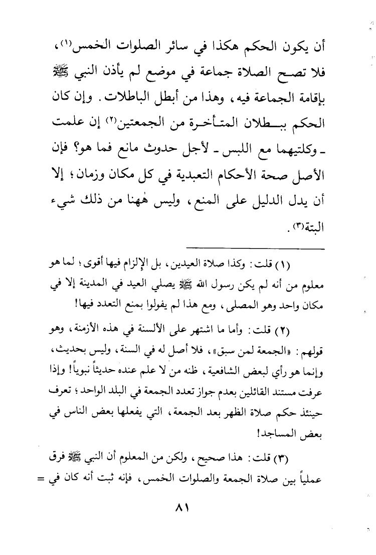 1 قلت: وكذا صلاة العيدين بل الإلزام فيها أقوى لما هو معلوم من أنه لم يكن رسول الله صلى الله عليه وسلم يصلي العيد في المدينة إلا في مكان واحد وهو المصلى ومع هذا لم يقولوا بمنع التعدد فيها!.