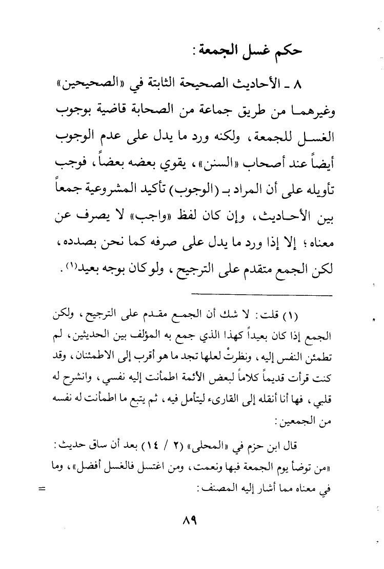8 - الأحاديث الصحيحة الثابتة في "الصحيحين" وغيرهما من طريق جماعة من الصحابة قاضية بوجوب الغسل للجمعة ولكنه ورد ما يدل على عدم الوجوب أيضا عند أصحاب "السنن" يقوي بعضه بعضا فوجب تأويله على أن المراد ب "الوجوب" تأكيد المشروعية جمعا بين الأحاديث وإن كان لفظ "واجب" لا يصرف عن معناه إلا إذا ورد ما يدل على صرفه كما نحن بصدده لكن الجمع متقدم على الترجيح ولو كان بوجه بعيد1