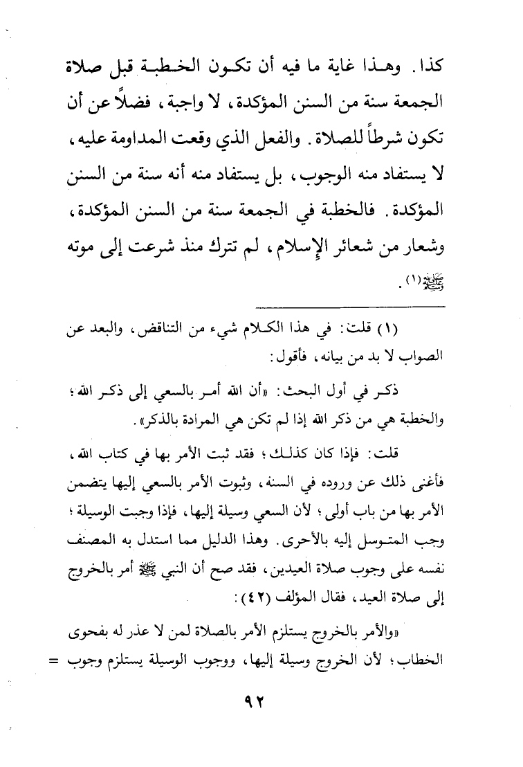 كذا. وهذا غاية ما فيه أن تكون الخطبة قبل صلاة الجمعة سنة من السنن المؤكدة لا واجبة فضلا عن أن تكون شرطا للصلاة. والفعل الذي وقعت المداومة عليه لا يستفاد منه الوجوب بل يستفاد منه أنه سنة من السنن المؤكدة. فالخطبة في الجمعة سنة من السنن المؤكدة وشعار من شعائر الإسلام لم تترك منذ شرعت إلى موته صلى الله عليه وسلم1