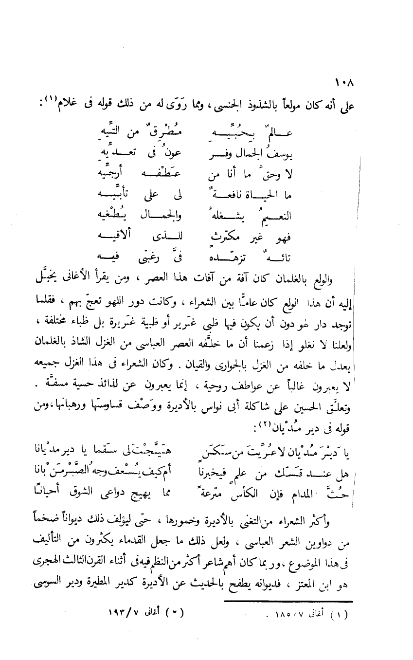 والولع بالغلمان كان آفة هذا العصر، ومن يقرأ الأغاني يخيل إليه أن هذا الولع كان عامًّا بين الشعراء، وكان دور اللهو تعج بهم؛ فقلما توجد دار لهو دون أن يكون فيها ظبي غرير أو ظبية غريرة بل ظباء مختلفة، ولعلنا لا نغلو إذا زعمنا أن ما خلفه العصر العباسي من الغزل الشاذ بالغلمان يعدل ما خلفه من الغزل بالجواري والقيان. وكان الشعراء في هذا الغزل جميعه لا يعبرون غالبًا عن عواطف روحية؛ إنما يعبرون عن لذائذ حسية مسفَّة. وتعلَّق الحسين على شاكلة أبي نواس بالأديرة ووَصف قساوستها ورهبانها، ومن قوله في دير مُدْيان2: