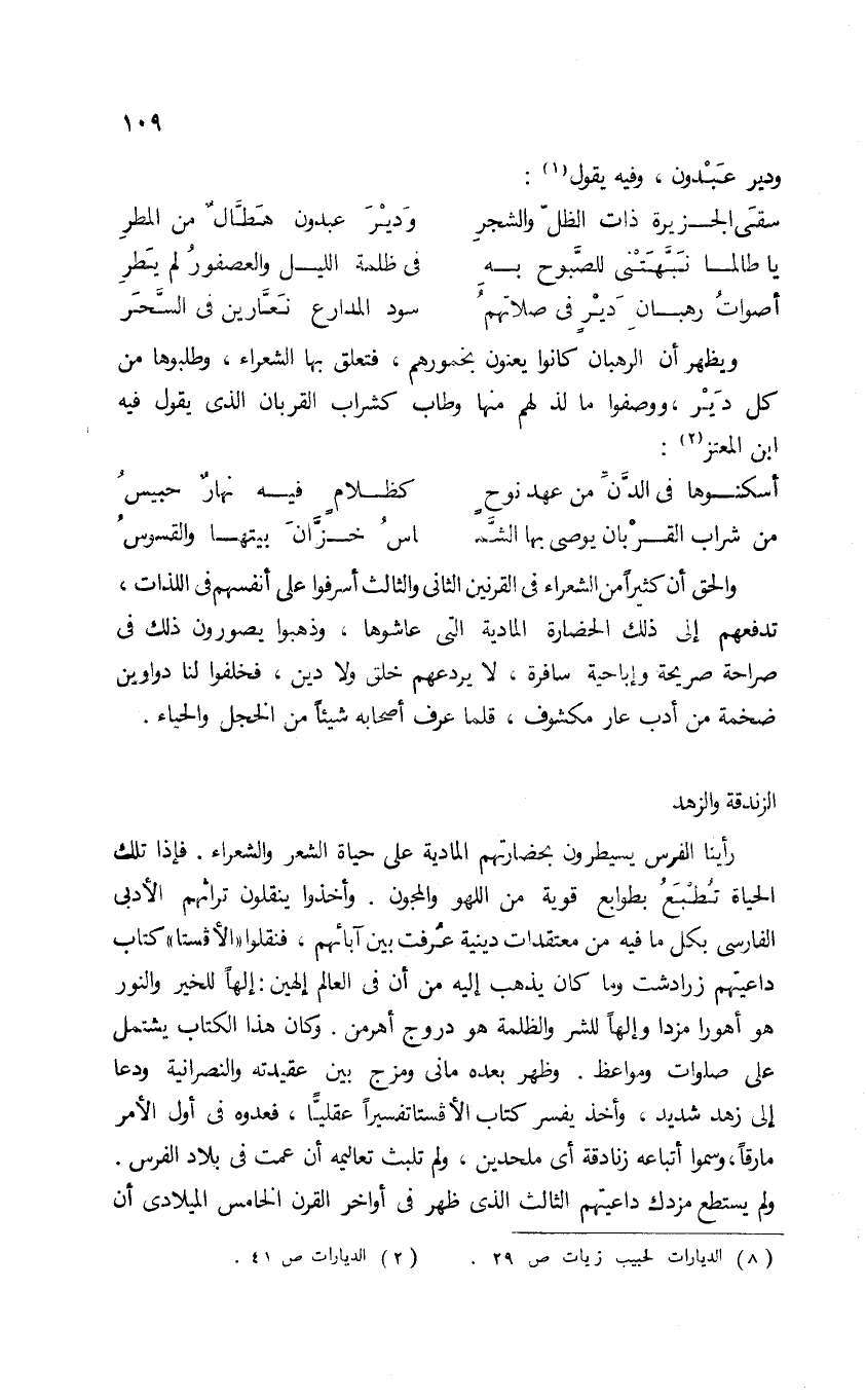 رأينا الفرس يسيطرون بحضارتهم المادية على حياة الشعر والشعراء؛ فإذا تلك الحياة تطبع بطوابع قوية من اللهو والمجون. وأخذوا ينقلون تراثهم الأدبي الفارسي بكل ما فيه من معتقدات دينية عرفت بين آبائهم، فنقلوا "الأفستا" كتاب داعيتهم زرادشت وما كان يذهب إليه من أن في العالم إلهين: إلَهًا للخير والنور هو أهورا مزدا، وإلَهًا للشر والظلمة هو دروج أهرمن. وكان هذا الكتاب يشتمل على صلوات ومواعظ. وظهر بعده ماني ومزج بين عقيدته والنصرانية ودعا إلى زهد شديد، وأخذ يفسر كتاب الأفستا تفسيرًا عقليًّا؛ فعدوه في أول الأمر مارقًا، وسموا أتباعه زنادقة أي ملحدين، ولم تلبث تعاليمه أن عمت في بلاد الفرس. ولم يستطع مزدك داعيتهم الثالث الذي ظهر في أواخر القرن الخامس الميلادي أن