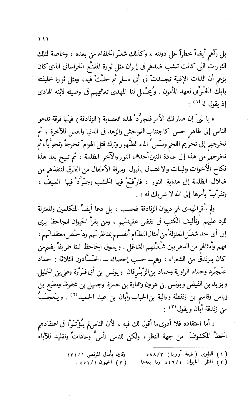 ولم يُقم المهدي لهم ديوان الزنادقة فحسب؛ بل دعا أيضًا المتكلمين والمعتزلة للرد عليهم وتأليف الكتب في نقض عقيدتهم، ومن يقرأ الحيوان للجاحظ يرى إلى أي حد شغل المعتزلة من أمثال النظّام أنفسهم بمناظراتهم ودَحْض معتقداتهم؛ فهم وأمثالهم من الدهريين شغلهم الشاغل. ويسوق الجاحظ ثبتًا طريفًا يضم من كان يتزندق من الشعراء، وهم -حسب إحصائه- الْحَمَّادون الثلاثة: حماد عجرد حماد الراوية وحماد بن الزّبْرِقان ويونس بن أبي فروة وعلى بن الخليل ويزيد بن الفيض ويونس بن هارون وعمارة بن حمزة وجميل بن محفوظ ومطيع بن إياس وقاسم بن زنقطة ووالبة بن الحباب وأبان بن عبد الحميد2. ويَعجَبُ من زندقة أبان ويقول3: