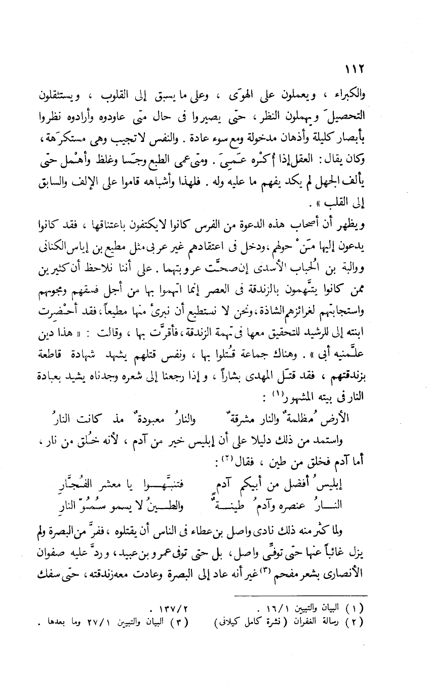 ولما كثر منه ذلك نادى واصل بن عطاء في الناس أن يقتلوه؛ ففرَّ إلى البصرة ولم يزل غائبها عنها حتى توفِّي واصل، بل حتى عمرو بن عبيد، وردَّ عليه صفوان الأنصاري بشعر مفحم3 غير أنه عاد إلى البصرة وعادت معه زندقته، حتى سفك