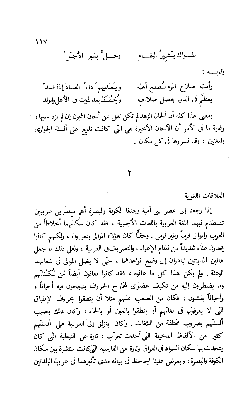 إذا رجعنا إلى عصر بني أمية وجدنا الكوفة والبصرة أهم مصرين عربيين تصطدم فيهما اللغة العربية باللغات الأجنبية؛ فقد كان سكانها أخلاطًا من العرب والموالي فرسًا وغير فرس. وحقًّا كان هؤلاء الموالي يتعربون، ولكنهم كانوا يجدون عناءً شديدًا من نظام الإعراب والتصريف في العربية، ولعل ذلك ما جعل هاتين المدينتين تبادران إلى وضع قواعدهما، حتى لا يضل الموالي في شعابهما الوعثة. ولم يكن هذا كل ما عانوه؛ فقد كانوا يعانون أيضًا من لكناتهم وما يضطرون إليه من تكيف عضوي لمخارج الحروف ينجحون فيه أحيانًا، وأحيانًا يفشلون، فكان من الصعب عليهم مثلًا أن ينطقوا بحروف الإطباق التي لا يعرفونها في لغاتهم أو ينطقوا بالعين أو بالحاء، وكان ذلك يصيب ألسنتهم بضروب مختلفة من اللثغات. وكان ينزلق إلى العربية على ألسنتهم كثير من الألفاظ الدخيلة التي أخذت تعرّب، تارة عن النبطية التي كان يتحدث بها سكان السواد في العراق وتارة عن الفارسية التي كانت منتشرة بين سكان الكوفة والبصرة، ويعرض علينا الجاحظ في بيانه مدى تأثيرهما في عربية البلدتين.