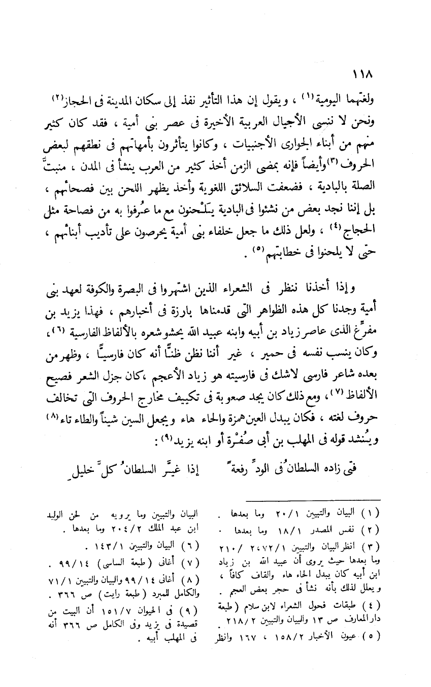 وإذا أخذنا ننظر في الشعراء الذين اشتهروا في البصرة والكوفة لعهد بني أمية وجدنا كل هذه الظواهر التي قدمناها بارزة في أخبارهم؛ فهذا يزيد بن مفرِّغ الذي عاصر زياد بن أبيه وابنه عبيد الله يحشو شعره بالألفاظ الفارسية6، وكان ينسب نفسه في حمير؛ غير أننا نظن ظنًّا أنه كان فارسيًّا، وظهر من بعده شاعر فارسي لا شك في فارسيته هو زياد الأعجم، كان جزل الشعر فصيح الألفاظ7، ومع ذلك كان يجد صعوبة في تكييف مخارج الحروف التي تخالف حروف لغته، فكان يبدل العين همزة والحاء هاء ويجعل السين شينًا والطاء تاء8 وينشد في قوله في المهلب بن أبي صفرة أو ابنه يزيد9: