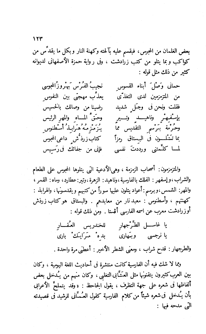 والمتزمزمون: أصحاب الزمزمة، وهي الأدعية التي يتلوها المجوس على الطعام والشراب، وإسفهر: الفلك بالفارسية، وناهيد: الزهرة، وتير: عطارد، وماه: القمر، والمهر: الشمس، وبرسم: أعواد يتلون عليه سوارًا من كتبهم ويقدسونها، والهرابذ: كهنتهم، وأسطنوس: معبد نار من معابدهم. والبستاق هو كتاب زرذش أو زرادشت معرب عن اسمه الفارسي أفستا. ومن ذلك قوله: