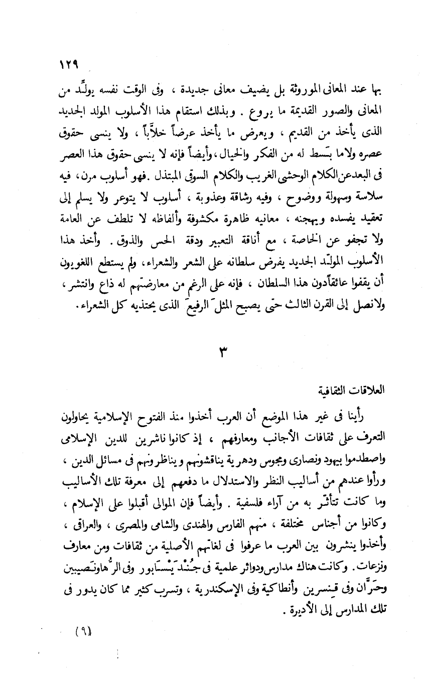بها عند المعاني الموروثة بل يضيف معاني جديدة، وفي الوقت نفسه يولد من المعاني والصور القديمة ما يروع. وبذلك استقام هذا الأسلوب المولد الجديد الذي يأخذ من القديم، ويعرض ما يأخذ عرضًا خلّابًا، ولا ينسى حقوق عصره ولا ما بسط له من الفكر والخيال، وأيضًا فإنه لا ينسى حقوق هذا العصر في البعد عن الكلام الوحشي الغريب والكلام السوقي المبتذل؛ فهو أسلوب مرن، فيه سلاسة وسهولة ووضوح، وفيه رشاقة وعذوبة، أسلوب لا يتورع ولا يسلم إلى تعقيد يفسده ويهجنه، معانيه ظاهر مكشوفة وألفاظه لا تلطف عن العامة ولا تجفو عن الخاصة، مع أناقة التعبير ودقة الحس والذوق. وأخذ هذا الأسلوب المولد الجديد يفر سلطانه على الشعر والشعراء، ولم يستطع اللغويون أن يقفوا عائقًا دون هذا السلطان؛ فإنه على الرغم من معارضتهم له ذاع وانتشر، ولا نصل إلى القرن الثالث حتى يصبح المثل الرفيع الذي يحتذيه كل الشعراء.