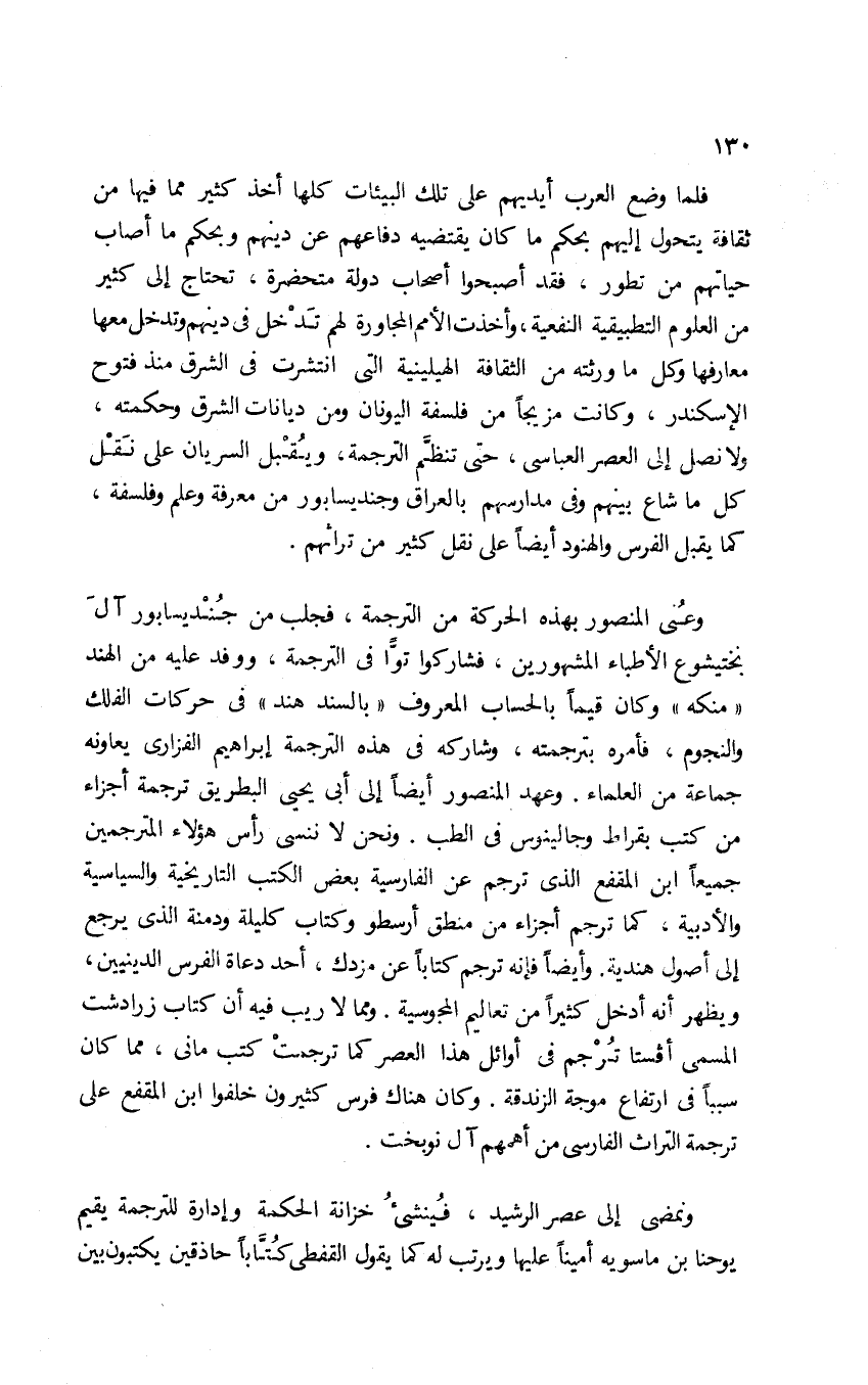 وعني المنصور بهذه الحركة من الترجمة؛ فجلب من جنديسابور آل بختيشوع الأطباء المشهورين، فشاركوا توًّا في الترجمة، ووفد عليه من الهند "منكه" وكان قيمًا بالحساب المعروف "بالسند هند" في حركات الفلك والنجوم؛ فأمره بتجرمته، وشاركه في هذه الترجمة إبراهيم الفزاري يعاونه جماعة من العلماء. وعهد المنصور أيضًا إلى أبي يحيى البطريق ترجمة أجزاء من كتب بقراط وجالينوس في الطب. ونحن لا ننسى رأس هؤلاء المترجمين جميعًا ابن المقفع الذي ترجم عن الفارسية بعض الكتب التاريخية والسياسية والأدبية، كما ترجم أجزاء من منطق أرسطوا وكتاب كليلة ودمنة الذي يرجع إلى أصول هندية. وأيضًا فإنه ترجم كتابًا من مزدك، أحد دعاة الفرس الدينيين، ويظهر أنه أدخل كثيرًا من تعاليم المجوسية، ومما لا ريب فيه أن كتاب زرادشت المسمى أفستا ترجم في أوائل هذا العصر، كما ترجمت كتب ماني؛ مما كان سببًا في ارتفاع موجة الزندقة، وكان هناك فرس كثيرون خلفوا ابن المقفع على ترجمة التراث الفارسي من أهمهم آل نوبخت.