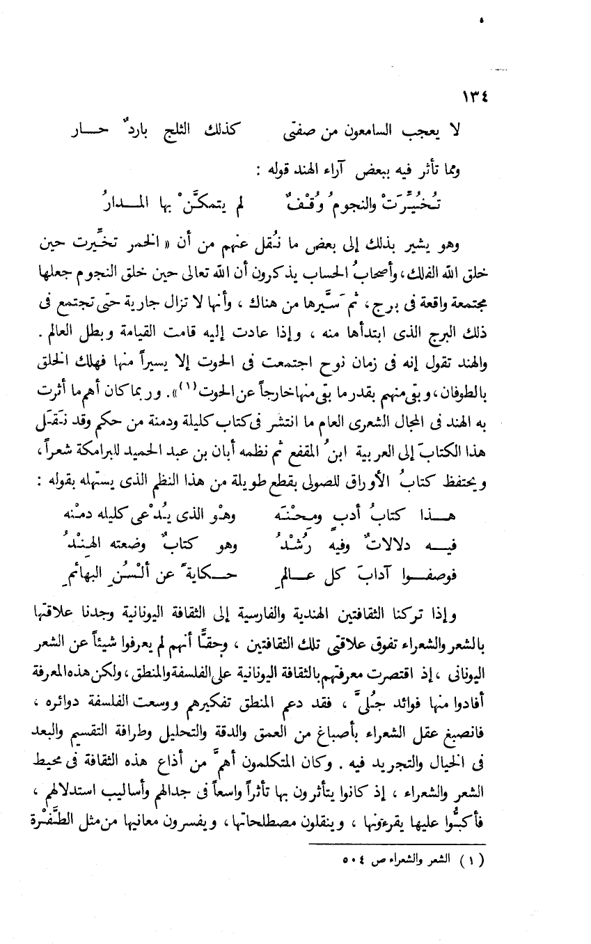 والهند تقول إنه في زمان نوح اجتمعت في الحوت إلا يسيرًا منها فهلك الخلق بالطوفان، وبقي منهم بقدر ما بقي منها خارجًا عن الحوت1" وربما كان أهم ما أثرت به الهند في المجال الشعري العام ما انتشر في كتاب كليلة ودمنة من حكم، وقد نقل هذا الكتاب إلى العربية ابن المقفع ثم نظمه أبان بن عبد الحميد للبرامكة شعرًا، ويحتفظ كتاب الأوراق للصولي بقطع طويلة من هذا النظم الذي يستهله بقوله: