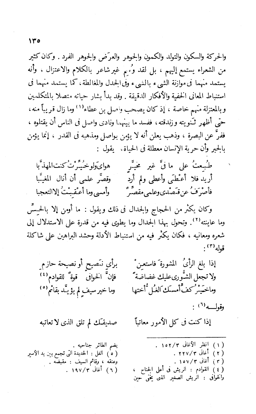 وكان يكثر من الحجاج والجدال في ذلك ويقول: ما أومن إلا بالحِسِّ وما عاينته2. وتحول بهذا الجدال وما يطوى فيه من قدرة على الاستدلال إلى شعره ومعانيه؛ فكان يكثر فيه من استنباط الأدلة وحشد البراهين على شاكلة قوله3: