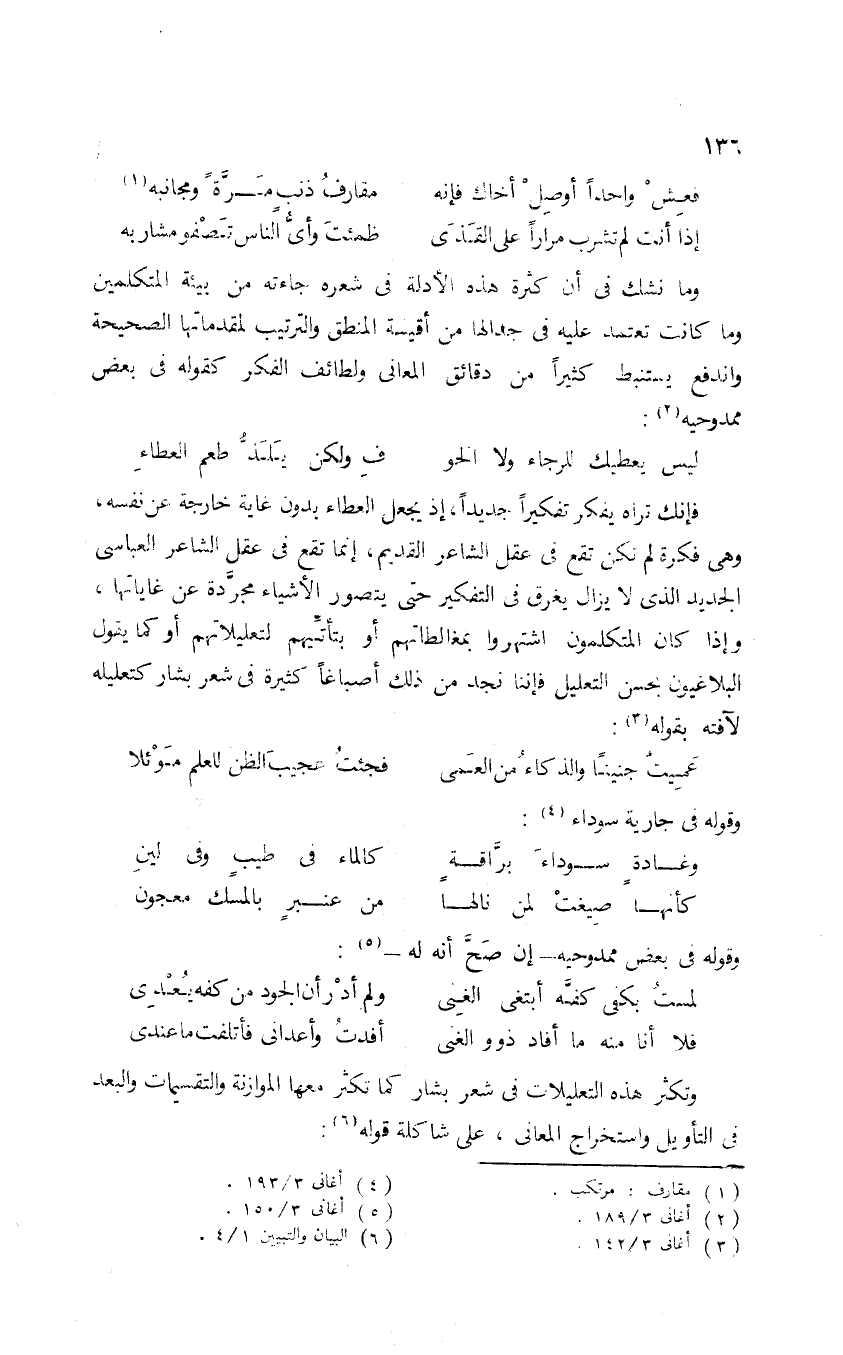 فإنك تراه يفكر تفكيرًا جديدًا؛ إذ يجعل العطاء بدون غاية خارجة عن نفسه، وهي فكرة لم تكن تقع في عقل الشاعر القديم؛ إنما تقع في عقل الشاعر العباسي الجديد الذي لا يزال يغرق في التفكير حتى يتصور الأشياء مجردة عن غاياتها، وإذا كان المتكلمون اشتهروا بمغالطاتهم أو بتأتِّيهم لتعليلاتهم، أو كما يقول البلاغيون بحسن التعليل؛ فإننا نجد من ذلك أصباغًا كثيرة في شعر بشار كتعليله لآفته بقوله3: