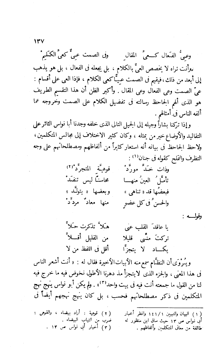 1 البيان والتبيين 1/ 141، وانظر أخبار أبي نواس ص13 حيث ساق ابن منظور له طائفة من معاني المتكلمين وألفاظهم.