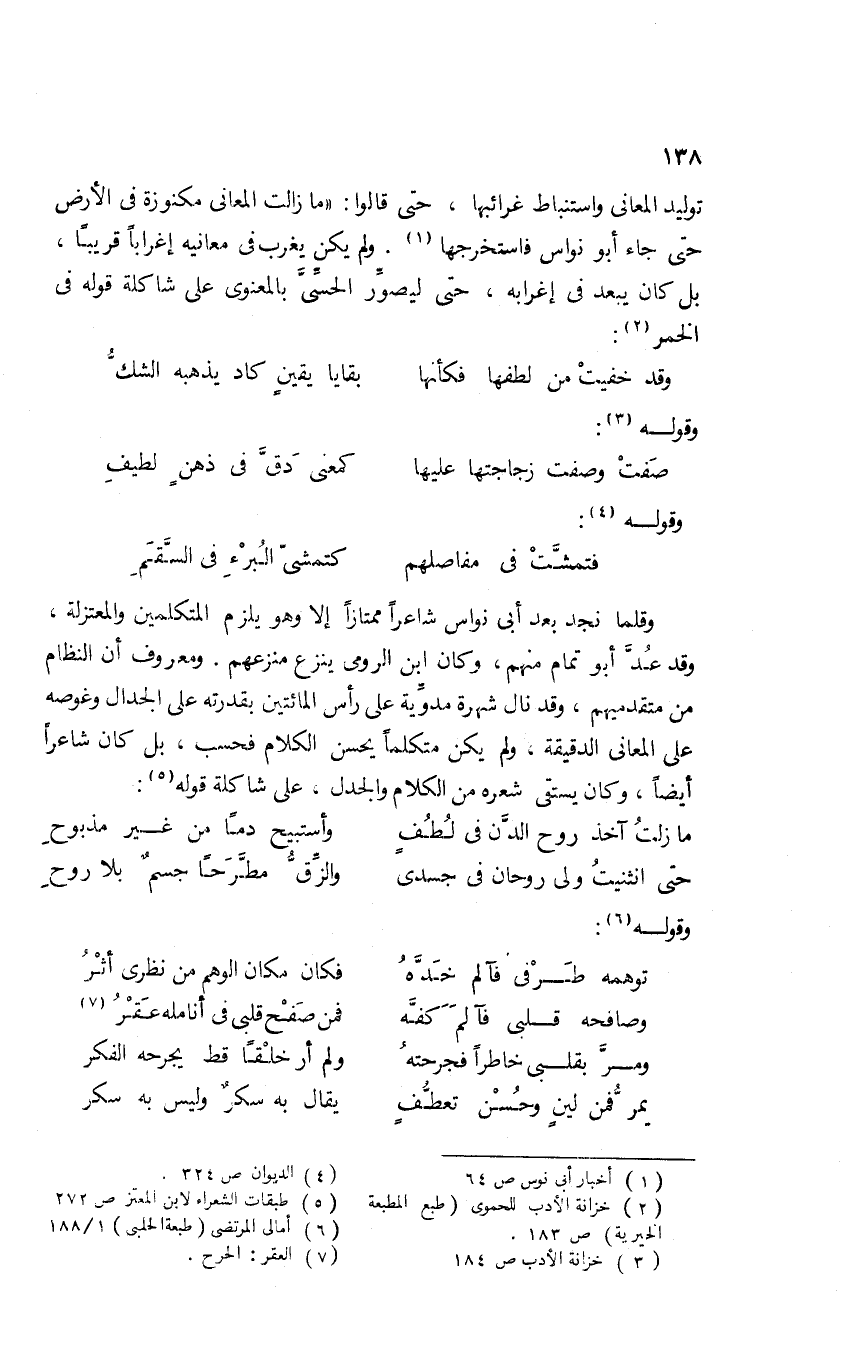 توليد المعاني واستنباط غرائبها، حتى قالوا: "مازالت المعاني مكنوزة في الأرض حتى جاء أبو نواس فاستخرجها1. ولم يكن يغرب في معانيه إغرابًا قريبًا، بل كان يبعد في إغرابه، حتى ليصوِّر الحسي بالمعنوي على شاكلة قوله في الخمر2: