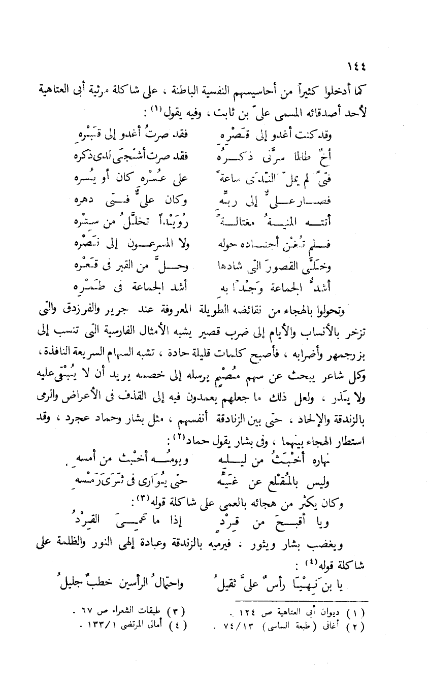كما أدخلوا كثيرًا من أحاسيسهم النفسية الباطنة على شاكلة مرثية أبي العتاهية لأحد أصدقائه المسمى علي بن ثابت، وفيه يقول1: