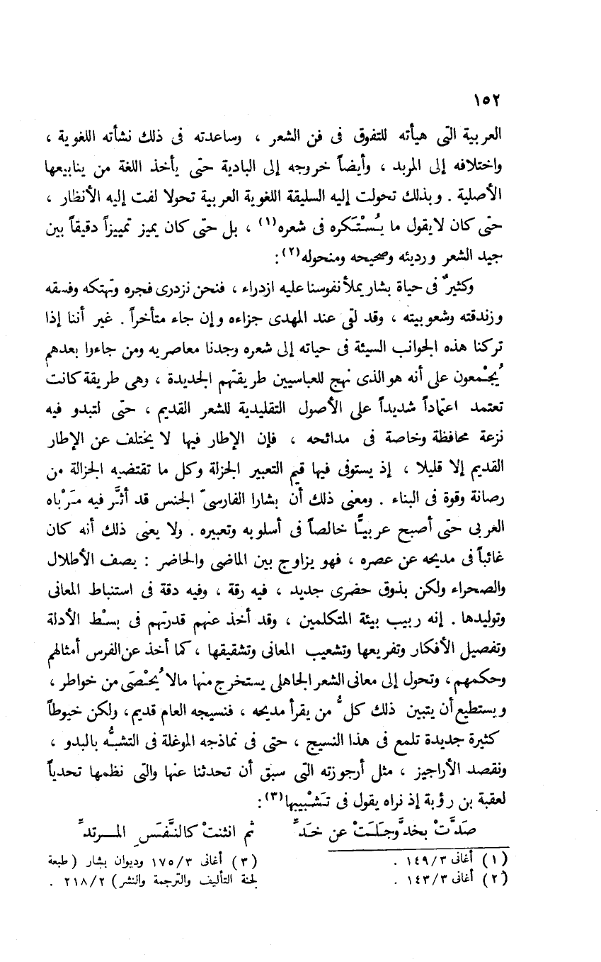 وكثير في حياة بشار يملأ نفوسنا عليه ازدراء؛ فنحن نزدري فجره وتهتكه وفسقه وزندقته وشعوبيته، وقد لقي عند المهدي جزاءه وإن جاء متأخرًا. غير أننا إذا تركنا هذه الجوانب السيئة في حياته إلى شعره وجدنا معاصريه ومن جاءوا بعدهم يجمعون على أنه هو الذي نهج للعباسيين طريقتهم الجديدة، وهي طريقة كانت تعتمد اعتمادًا شديدًا على الأصول التقليدية للشعر القديم، حتى لتبدو فيه نزعة محافظة وخاصة في مدائحه، فإن الإطار فيها لا يختلف عن الإطار القديم إلا قليلًا؛ إذ يستوفي فيها قيم التعبير الجزلة وكل ما تقتضيه الجزالة من رصانة وقوة في البناء، ومعنى ذلك أن بشارًا الفارسي الجنس قد أثر فيه مرباه العربي حتى أصبح عربيًّا خالصًا في أسلوبه وتعبيره. ولا يعني ذلك أنه كان غائبًا في مديحه عن عصره؛ فهو يزاوج بين الماضي والحاضر: يصف الأطلال والصحراء ولكن بذوق حضري جديد فيه رقة، وفيه دقة في استنباط المعاني وتوليدها. إنه ربيب بيئة المتكلمين، وقد أخذ عنهم قدرتهم في بسط الأدلة وتفصيل الأفكار وتفريعها وتشعيب المعاني وتشقيقها، كما أخذ عن الفرس أمثالهم وحكمهم، وتحول إلى معاني الشعر الجاهلي يستخرج منها ما لا يحصى من خواطر، ويستطيع أن يتبين ذلك كل من يقرأ مديحه؛ فنسيجه العام قديم، ولكن خيوطًا كثيرة جديدة تلمع في هذا النسيج، حتى في نماذجه الموغلة في التشبه بالبدو، ونقصد الأراجيز، مثل أرجوزته التي سبق أن تحدثنا عنها والتي نظمها تحديًّا لعقبة بن رؤبة إذ نراه يقول في تشبيهها3: