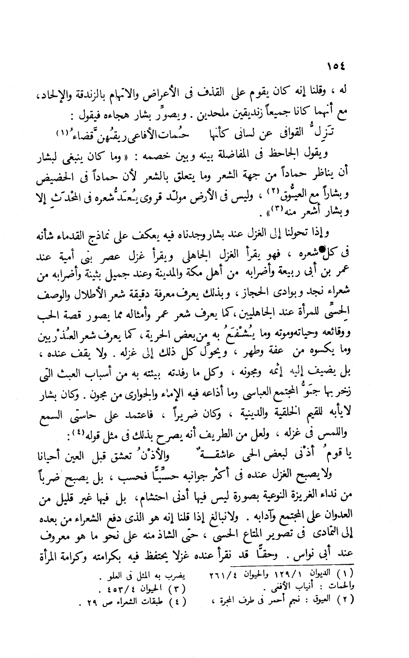 ولا يصبح الغزل عنده في أكثر جوانبه حسيًّا فحسب، بل يصبح ضربًا من نداء الغريزة النوعية بصورة ليس فيها أدني احتشام؛ بل فيها غير قليل من العدوان على المجتمع وآدابه. ولا نبالغ إذا قلنا إنه هو الذي دفع الشعراء من بعده إلى التمادي في تصوير المتاع الحسي، حتى الشاذ منه على نحو ما هو معروف عند أبي نُواس. وحقًّا قد نقرأ عنده غزلًا يحتفظ فيه بكرامته وكرامة المرأة