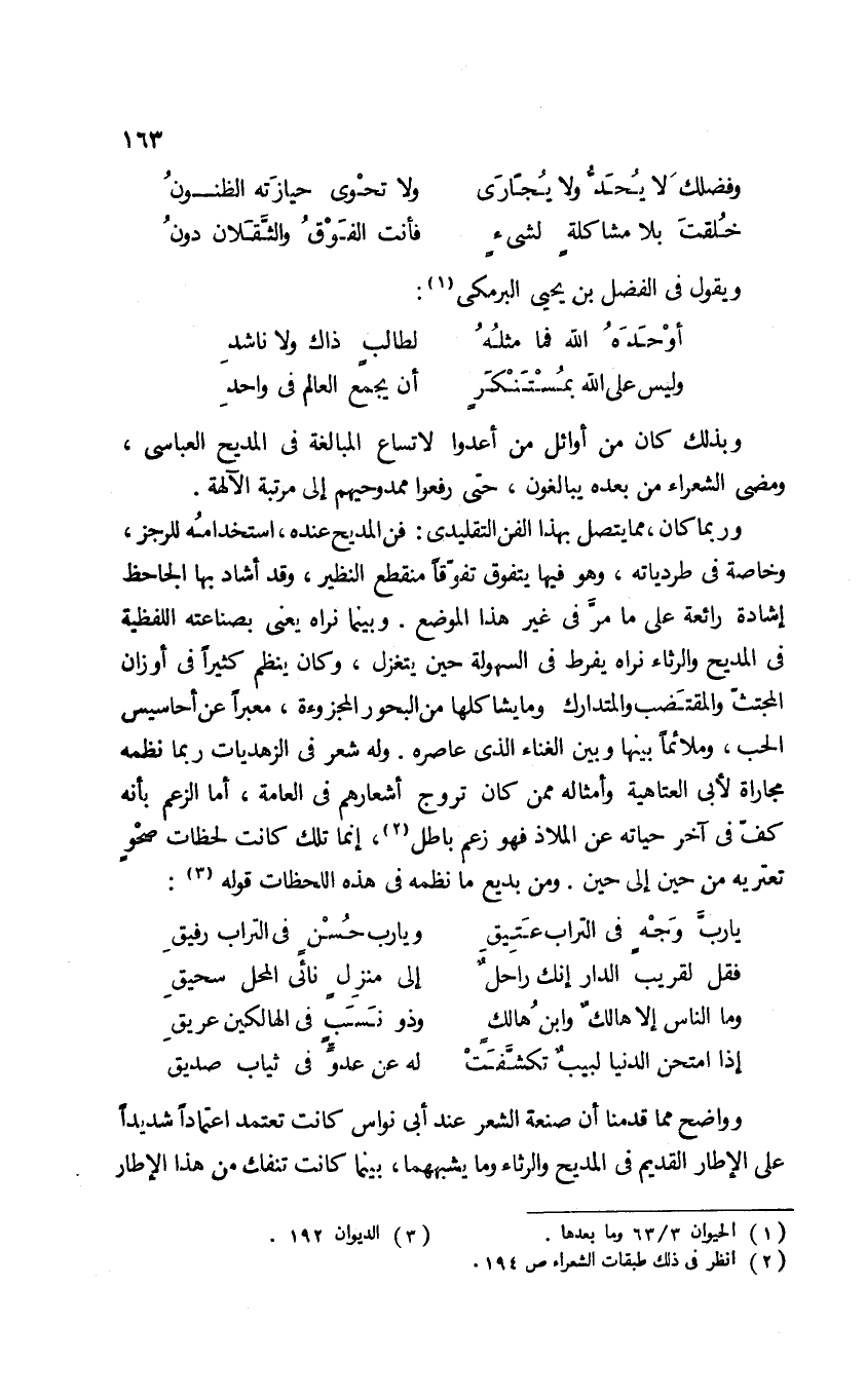 وربما كان -مما يتصل بهذا الفن التقليدي- فن المديح عنده، استخدامه للرجز، وخاصة في طردياته، وهو فيها يتفوق تفوقًا منقطع النظير، وقد أشاد بها الجاحظ إشادة رائعة على ما مر في غير هذا الموضع؛ وبينما نراه يعنى بصناعته اللفظية في المديح والرثاء نراه يفرط في السهولة حين يتغزل، وكان ينظم كثيرًافي أوزان المجتث والمقتضب والمتدارك وما يشاكلها من البحور المجزوءة، معبرًا عن أحاسيس الحب، وملائمًا بينها وبين الغناء الذي عاصره، وله شعر في الزهديات ربما نظمه مجاراة لأبي العتاهية وأمثاله ممن كان تروج أشعارهم في العامة، أما الزعم بأنه كفَّ في آخر حياته عن الملاذ فهو زعم باطل2، إنما تلك كانت لحظات صحو تعتريه من حين إلى حين. ومن بديع ما نظمه في هذه اللحظات قوله3: