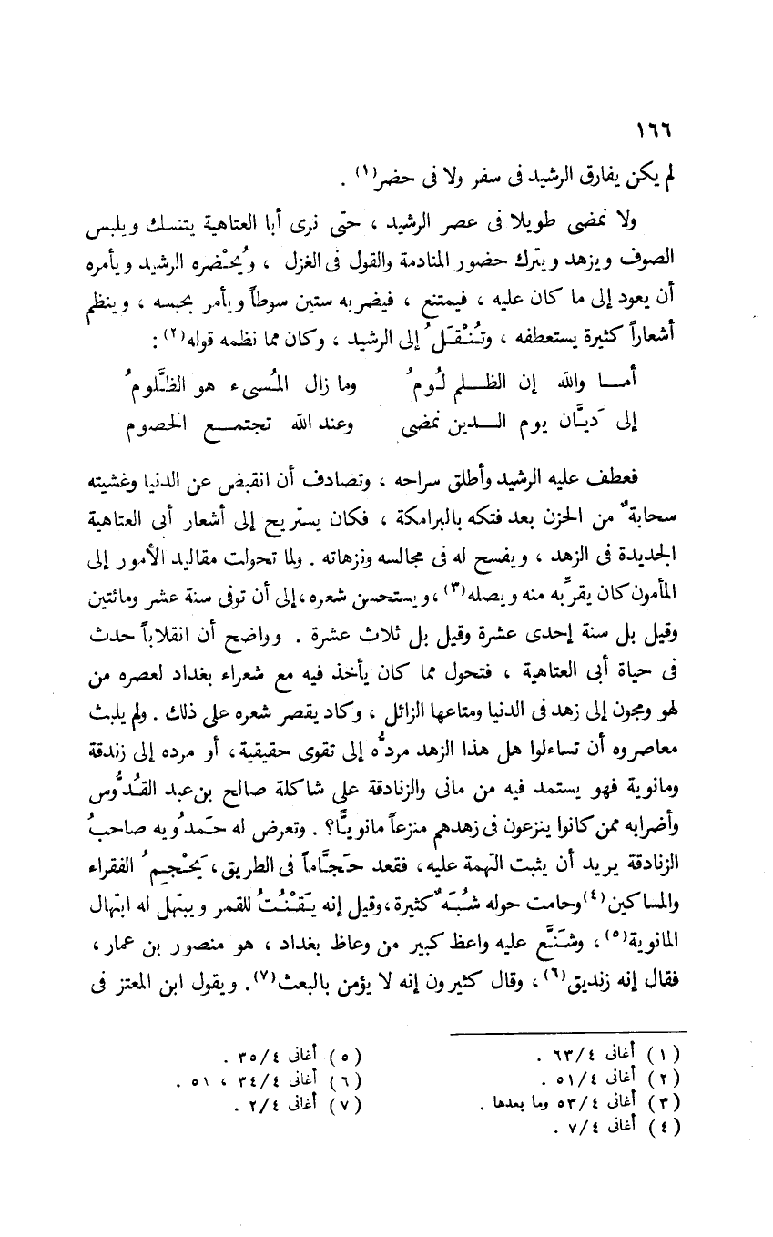 فعطف عليه الرشيد وأطلق سراحه، وتصادف أن انقبض عن الدنيا وغشيته سحابة من الحزن بعد فتكه بالبرامكة؛ فكان يستريح إلى أشعار أبي العتاهية الجديدة في الزهد، ويفسح له في مجالسه ونزهاته. ولما تحولت مقاليد الأمور إلى المأمون كان يقربه منه ويصله3، ويستحسن شعره، إلى أن توفي سنة عشر ومائتين وقيل بل سنة إحدى عشرة وقيل بل ثلاث عشرة. وواضح أن انقلابًا حدث في حياة أبي العتاهية؛ فتحول مما كان يأخذ فيه مع شعراء بغداد لعصره من لهوٍ ومجون إلى زهد في الدنيا ومتاعها الزائل، وكاد يقصر شعره على ذلك. ولم يلبث معاصروه أن تساءلوا هل هذا الزهد مردُّهُ إلى تقوى حقيقية، أو مردُّه إلى زندقة ومانوية فهو يستمد فيه من ماني، والزنادقة على شاكلة صالح بن عبد القدوس وأضرابه ممكن كانوا ينزعون في زهدهم منزعًا مانويًّا. وتعرض له حموديه صاحب الزنادقة يريد أن يثبت التهمة عليه؛ فقعد حجَّامًا في الطريق، يحجم الفقراء والمساكين4 وحامت حوله شبه كثيرة، وقيل: إنه يقنت للقمر ويبتهل له ابتهال المانوية5، وشنع عليه واعظ كبير من وعاظ بغداد، هو منصور بن عمار؛ فقال إنه زنديق6 وقال كثيرون: إنه لا يؤمن بالبعث7. ويقول ابن المعتز في
