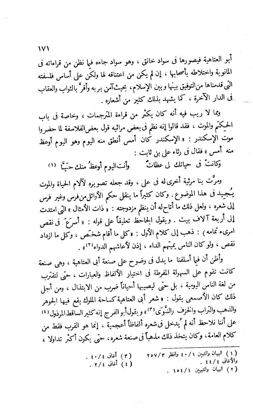 ومرت بنا مرثية أخرى له في علي، وقد جعله تصويره لآلام الحياة والموت يجيد في هذا الموضوع، وكان كثيرًا ما ينقل حكم الأوائل من فرس وغير فرس إلى شعره، ولعل ذلك ما أتاح له أن ينظم مزدوجته "ذات الأمثال" التي امتدت إلى أربعة آلاف بيت، ويقول الجاحظ تعليقًا على قوله: "أسرع في نقص أمرئ تمامه"، ذهب إلى كلام الأول: "كل ما أقام شخص، وكلما ازداد نقص، ولو كان الناس يميتهم الداء، إذن لأعاشهم الدواء"2.