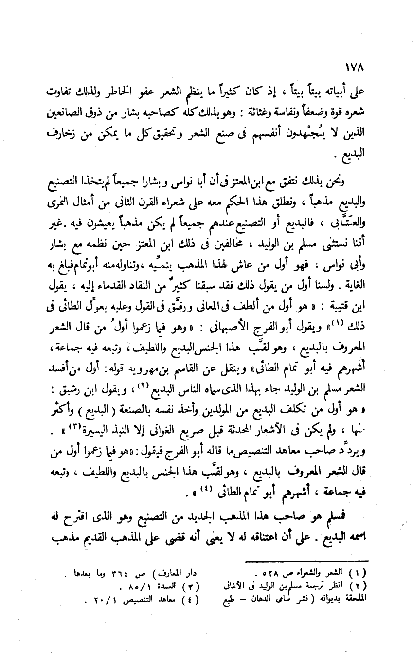 ونحن بذلك نتفق مع ابن المعتز في أن أبا نواس وبشارًا جميعًا لم يتخذا التصنيع والبديع مذهبًا، ونطلق هذا الحكم معه على شعراء القرن الثاني من أمثال النميري والعتابي؛ فالبديع أو التصنيع عندهم جميعًا لم يكن مذهبًا يعيشون فيه؛ غير أننا نستثني مسلم بن الوليد، مخالفين في ذلك ابن المعتز حين نظمه مع بشار وأبي نواس؛ فهو أول من عاش لهذا المذهب ينمِّيه، وتناوله منه أبو تمام فبلغ به الغاية، ولسنا أول من يقول ذلك فقد سبقنا كثير من النقاد القدماء إليه، يقول ابن قتيبة: "هو أول من ألطف في المعاني ورقق في القول وعليه يعوِّل الطائي في ذلك"1، ويقول أبو الفرج الأصبهاني: "وهو فيما زعموا أول من قال الشعر المعروف بالبديع، وهو لقَّب هذا الجنس البديع واللطيف، وتبعه فيه جماعة، أشهرهم فيه أبو تمام الطائي"، وينقل عن القاسم بن مهرويه قوله: أول من أفسد الشعر مسلم بن الوليد جاء بهذا الذي سمَّاه الناس بالبديع2، ويقول ابن رشيق: "هو أول من تكلف البديع من المولدين وأخذ نفسه بالصنعة -البديع- وأكثر منها، ولم يكن في الأشعار المحدثة قبل صريع الغواني إلا النُّبَذ اليسيرة"3.