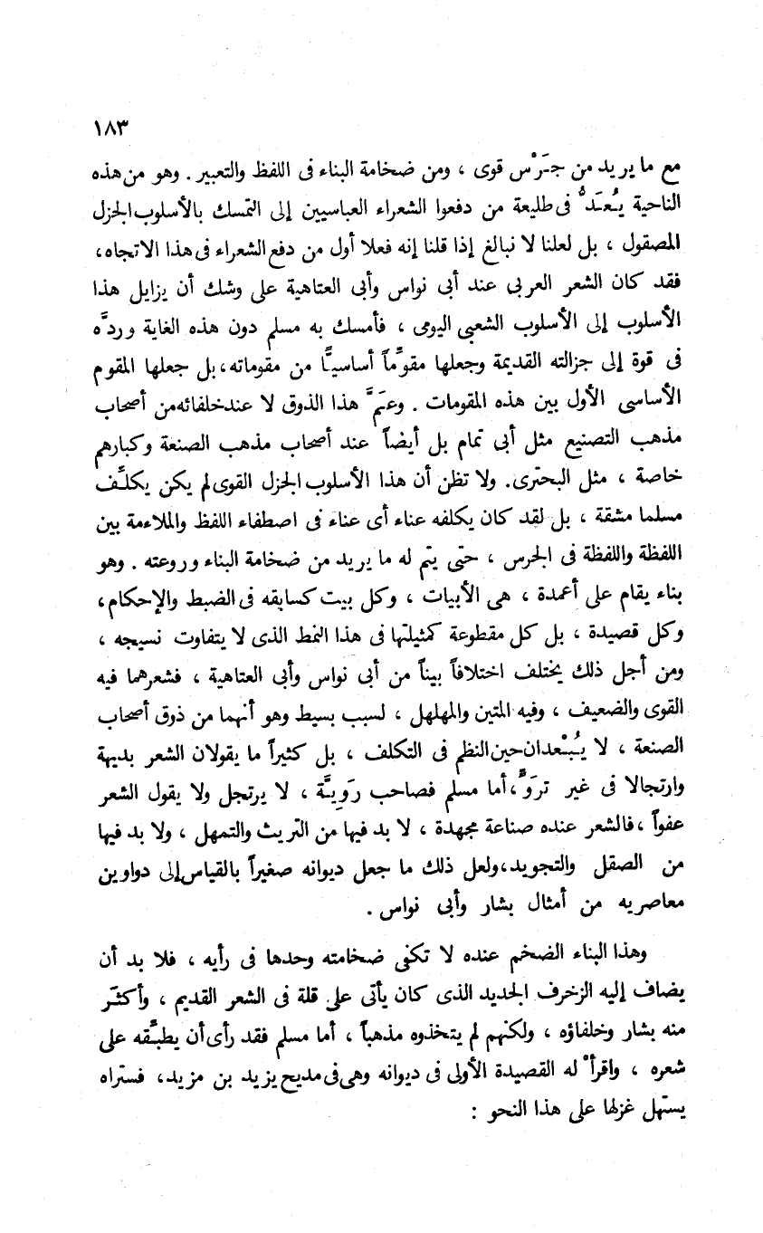 مع ما يريد من جرس قوي، ومن ضخامة البناء في اللفظ والتعبير. وهو من هذه الناحية يعدُّ في طليعة من دفعوا الشعراء العباسيين إلى التمسك بالأسلوب الجزل المصقول؛ بل لعلنا لا نبالغ إذا قلنا إنه فعلًا أول من دفع الشعراء في هذا الاتجاه؛ فقد كان الشعر العربي عند أبي نواس وأبي العتاهية على وشك أن يزايل هذا الأسلوب إلى الأسلوب الشعبي اليومي، فأمسك به مسلم دون هذه الغاية وردَّه في قوة إلى جزالته القديمة وجعلها مقومًا أساسيًّا من مقوماته، بل جعلها المقوم الأساسي الأول بين هذه المقومات. وعمَّ هذا الذوق لا عند خلفائه من أصحاب مذهب التصنيع مثل أبي تمام بل أيضًا عند أصحاب مذهب الصنعة وكبارهم خاصة، مثل البحتري. ولا تظن أن هذا الأسلوب الجزل القوي لم يكن يكلف مسلمًا مشقة؛ بل لقد كان يكلفه عناء أي عناء في اصطفاء اللفظ والملاءمة بين اللفظة واللفظة في الجرس، حتى يتم له ما يريد من ضخامة البناء وروعته. وهو بناء يقام على أعمدة هي الأبيات، وكل بيت كسابقه في الضبط والإحكام، وكل قصيدة بل كل مقطوعة كمثيلتها في هذا النمط الذي لا يتفاوت نسيجه، ومن أجل ذلك يختلف اختلافًا بينًا عن أبي نواس وأبي العتاهية، فشعرهما فيه القوي والضعيف، وفيه المتين والمهلهل، لسبب بسيط وهو أنهما من ذوق أصحاب الصنعة، لا يبعدان حين النظم في التكلف، بل كثيرًا ما يقولان الشعر بديهة وارتجالًا في غير تَروٍّ، أما مسلم فصاحب رَويَّة، لا يرتجل ولا يقول الشعر عفوًا؛ فالشعر عنده صناعة مجهدة، لا بد فيها من التريث والتمهل، ولا بد فيها من الصقل والتجويد، ولعل ذلك ما جعل ديوانه صغيرًا بالقياس إلى دواوين معاصريه من أمثال بشار وأبي نواس.