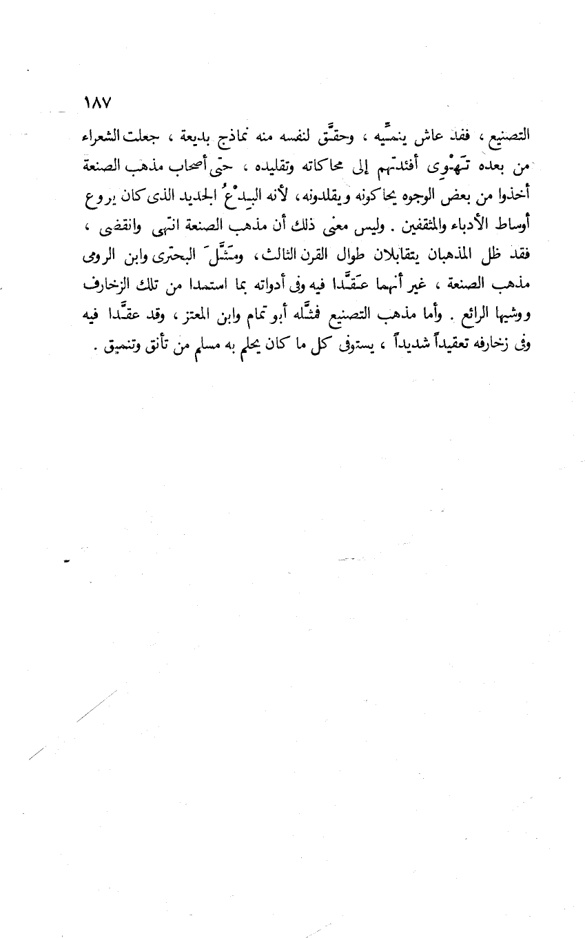 التصنيع؛ فقد عاش ينميه، وحقق لنفسه منه نماذج بديعة، جعلت الشعراء من بعده تهوى أفئدتهم إلى محاكاته وتقليده؛ حتى أصحاب مذهب الصنعة أخذوا من بعض الوجوه يحاكونه ويقلدونه؛ لأنه البدع الجديد الذي كان يروع أوساط الأدباء والمثقفين. وليس معنى ذلك أن مذهب الصنعة انتهى وانقضى؛ فقد ظل المذهبان يتقابلان طوال القرن الثالث، ومَثَّل البحتري وابن الرومي مذهب الصنعة؛ غير أنهما عقَّدا فيه وفي أدواته بما استمدا من تلك الزخارف ووشيها الرائع. وأما مذهب التصنيع فمثَّله أبوتمام وابن المعتز، وقد عقَّدا فيه وفي زخارفه تعقيدًا شديدًا، يستوفي كل ما كان يحلم من تأنق وتنميق.