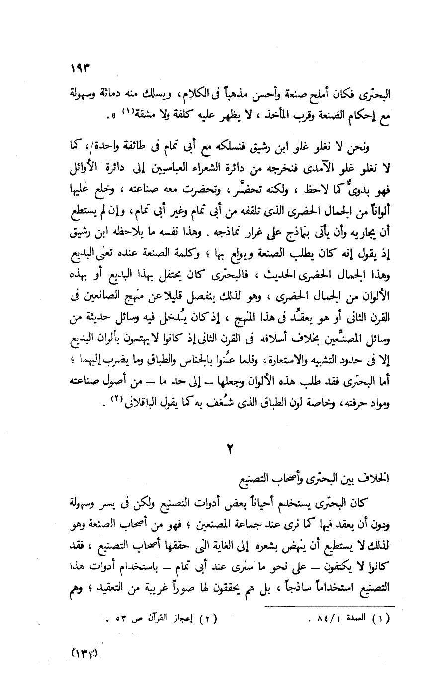 ونحن لا نغلو غلو ابن رشيق فنسلكه مع أبي تمام في طائفة واحدة، كما لا نغلو غلو الآمدي فنخرجه من دائرة الشعراء العباسيين إلى دائرة الأوائل فهو بدوي كما لاحظ؛ ولكنه تحضر، وتحضرت معه صناعته، وخلع عليها ألوانًا من الجمال الحضري الذي تلقفه من أبي تمام وغير أبي تمام، وإن لم يستطع أن يجاريه وأن يأتي بنماذج على غرار نماذجه، وهذا نفسه ما يلاحظه ابن رشيق؛ إذ يقول إنه كان يطلب الصنعة ويولع بها، وكلمة الصنعة عنده تعني البديع، وهذا الجمال الحضري الحديث؛ فالبحتري كان يحتفل بهذا البديع أو بهذه الألوان من الجمال الحضري، وهو لذلك ينفصل قليلًا عن منهج الصانعين في القرن الثاني أو هو يعقِّد في هذا المنهج؛ إذ كان يدخل فيه وسائل حديثة من وسائل المصنعين بخلاف أسلافه في القرن الثاني؛ إذ كانوا لا يهتمون بألوان البديع إلا في حدود التشبيه والاستعارة، وقلما عنوا بالجناس والطباق وما يضرب إليهما؛ أما البحتري فقد طلب هذه الألوان وجعلها -إلى حد ما- من أصول صناعته ومواد حرفته، وخاصة لون الطباق الذي شغف به كما يقول الباقلاني2