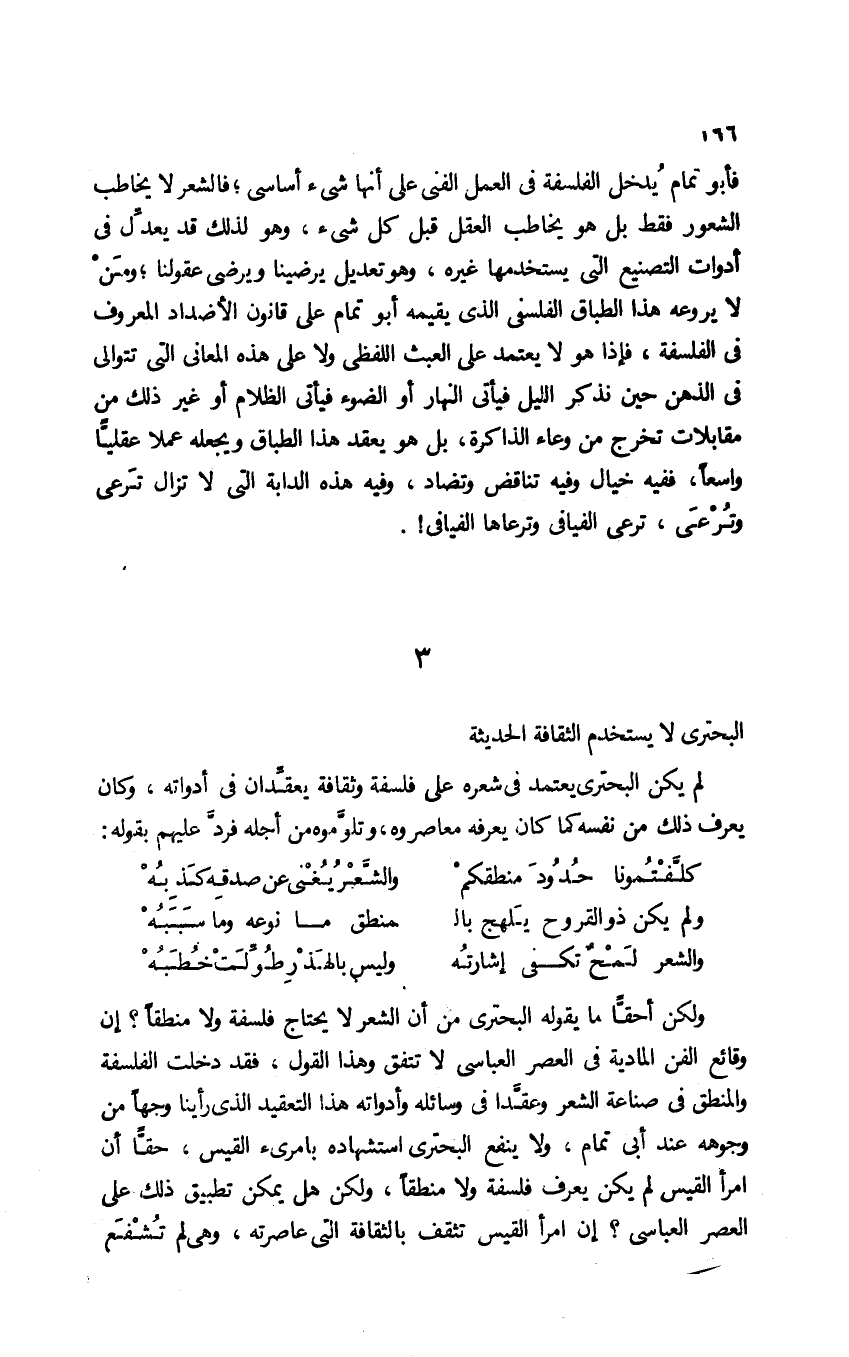 ولكن أحقًّا ما يقول البحتري من أن الشعر لا يحتاج فلسفة ولا منطقًا؟ إن وقائع الفن المادية في العصر العباسي لا تتفق وهذا القول؛ فقد دخلت الفلسفة والمنطق في صناعة الشعر وعقَّدا في وسائله وأدواته هذا التعقيد الذي رأينا وجها من وجوهه عند أبي تمام، ولا ينفع البحتري استشهاده بامرئ القيس، حقًّا أن امرأ القيس لم يكن يعرف فلسفة ولا منطقًا، ولكن هل يمكن تطبيق ذلك على العصر العباسي؟ إن امرأ القيس تثقف بالثقافة التي عاصرته، وهي لم تشفع