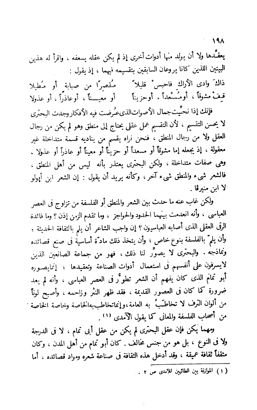 ولكن غاب عنه ما حدث بين الشعر والمنطق أو الفلسفة من تزاوج في العصر العباسي، وأنه انعدمت بينهما الحدود والحواجز، وما تقدم الزمن إذن؟ وما فائدة الرقي العقلي الذي أصابه العباسيون؟ إن واجب الشاعر أن يلم بالثقافة الحديثة، وأن يلم بالفلسفة بنوع خاص، وأن يتخذ ذلك مادة أساسية في صنع قصائده ونماذجه. والبحتري لا يصور لنا ذلك؛ فهو من جماعة الصانعين الذين لا يسرفون على أنفسهم في استعمال أدوات الصناعة وتعقيدها؛ إنما يصوره أبو تمام الذي كان يفهم أن الشعر تطور في العصر العباسي، وأنه لم يعد ضرورة كما كان في العصور القديمة؛ فقد ظهر النثر وزاحمه، وأصبح لونا من ألوان الترف لا تخاطب به العامة، وإنما تخاطب به الخاصة وخاصة الخاصة من أصحاب الفلسفة والمعاني كما يقول الآمدي1.