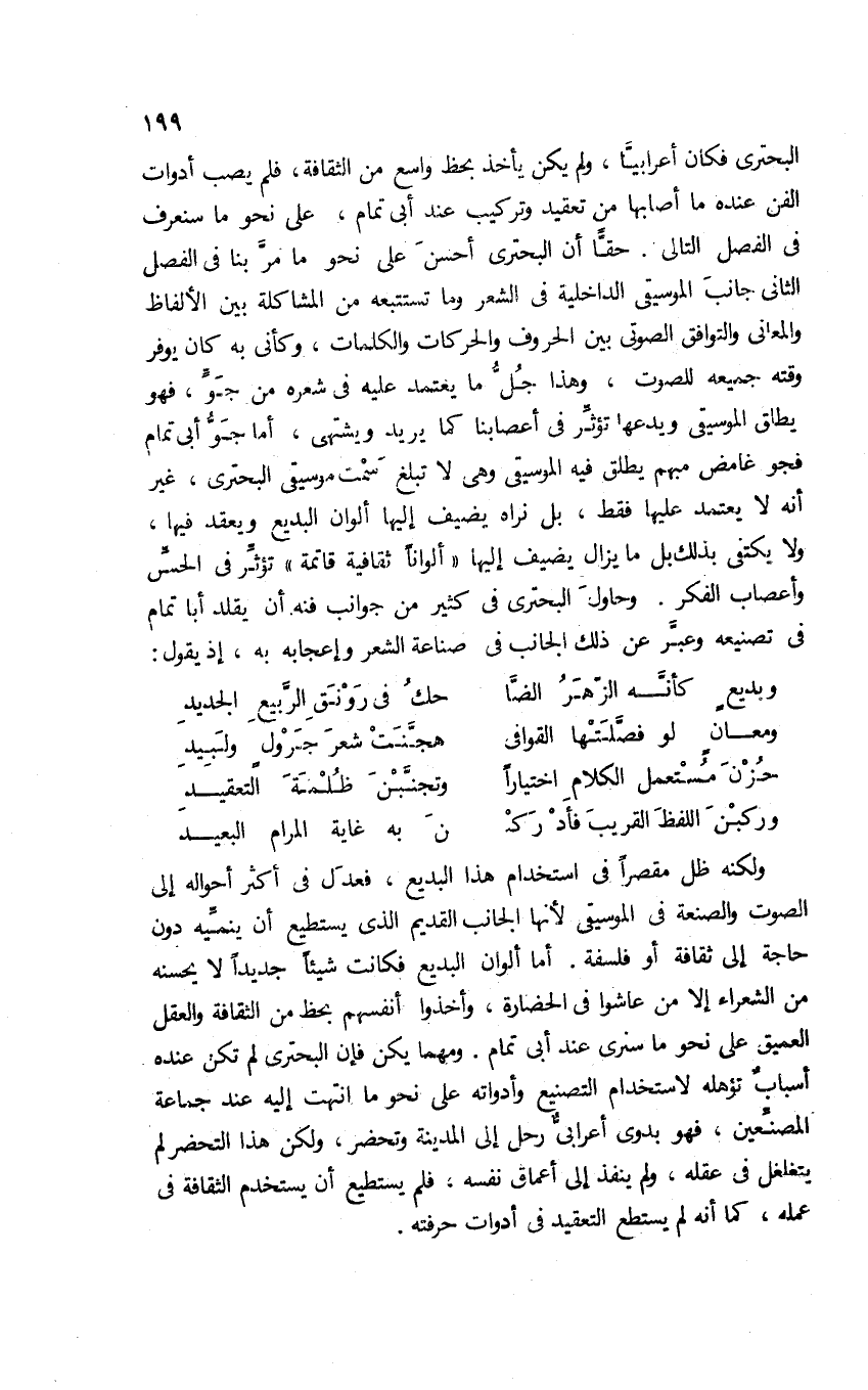 ولكنه ظل مقصرًا في استخدام هذا البديع؛ فعدل في أكثر أحواله إلى الصوت والصنعة في الموسيقى؛ لأنها الجانب القديم الذي يستطيع أن ينميه دون حاجة إلى ثقافة أو فلسفة. أما ألوان البديع فكانت شيئًاجديدًا لا يحسنه من الشعراء إلا من عاشوا في الحضارة، وأخذوا أنفسهم بحظ من الثقافة والعقل العميق على نحو ما سنرى عند أبي تمام. ومهما يكن فإن البحتري لم تكن عنده أسباب تؤهله لاستخدام التصنيع وأدواته على نحو ما انتهت إليه عند جماعة المصنعين؛ فهو بدوي أعرابي رحل إلى المدينة وتحضر، ولكن هذا التحضر لم يتغلغل في عقله ولم ينفذ إلى أعماق نفسه؛ فلم يستطع أن يستخدم الثقافة في عمله، كما أنه لم يستطع التعقيد في أدوات حرفته.