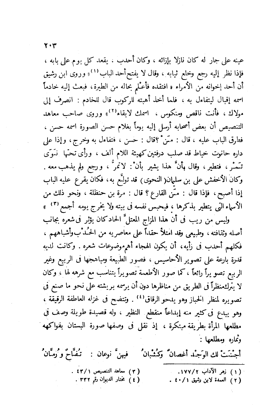 "وكان الأخفش علي بن سليمان النَّحْوي قد تولَّع به؛ فكان يقرع عليه الباب إذا أصبح، فإذا قال: من القارع؟ قال: مرَّة بن حنظلة، ونحو ذلك من الأسماء التي يتطير بذكرها، فيحبس نفسه في بيته ولا يخرج يومه أجمع"3 وليس من ريب في أن هذا المزاج المعتل الحاد كان يؤثر في شعره بجانب أصله وثقافته، وطبيعي وقد امتلأ حقدًا على معاصريه من الحدب وأشباههم؛ فكلهم أحدب في رأيه، أن يكون الهجاء أهم موضوعات شعره. وكان لديه قدرة بارعة على تصوير الأحاسيس، فصور الطبيعة ومباهجها في الربيع وغير الربيع تصويرًا رائعًا، كما صور الأطعمة تصويرًا يتناسب مع شرهه لها، وكان لا يترك منظرًا في الطريق من مناظرها دون أن يرسمه بريشته على نحو ما صنع في تصويره لمنظر الخباز وهو يدحو الرقاق4. وتتضح في غزله العاطفة الرقيقة، وهو يبدع في كثير منه إبداعًا منقطع النظير، وله قصيدة طويلة وصف في مطلعها المرأة بطريقة مبتكرة؛ إذ نقل في وصفها صورة البستان بفواكهه وثماره ومطلعها: