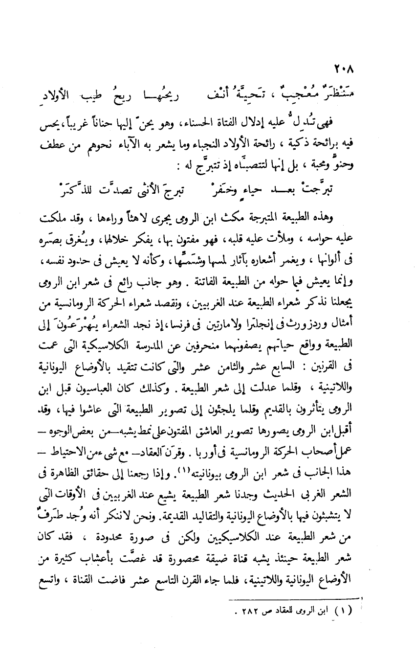 وهذه الطبيعة المتبرجة مكث ابن الرومي يجري لاهثًا وراءها، وقد ملكت عليه حواسه، وملأت عليه قلبه؛ فهو مفتون بها، يفكر خلالها، ويُغرق بصره في ألوانها، ويغمر أشعاره بآثار لمسها وشمِّها، وكأنه لا يعيش في حدود نفسه؛ وإنما يعيش فيما حوله من الطبيعة الفاتنة. وهو جانب رائع في شعر ابن الرومي، يجعلنا نذكر شعراء الطبيعة عند الغربيين، ونقصد شعراء الحركة الرومانسية من أمثال وردزورث في إنجلترا ولامارتين في فرنسا؛ إذ نجد الشعراء يُهرعون إلى الطبيعة وواقع حياتهم يصفونهما منحرفين عن المدرسة الكلاسيكية التي عمت في القرنين السابع عشر والثامن عشر والتي كانت تتقيد بالأوضاع اليونانية واللاتينية، وقلما عدلت إلى شعر الطبيعة. وكذلك كان العباسيون قبل ابن الرومي يتأثرون بالقديم وقلما يلجئون إلى تصوير الطبيعة التي عاشوا فيها، وقد أقبل ابن الرومي يصورها تصوير العاشق المفتون على نمط يشبه -من بعض الوجوه- عمل أصحاب الحركة الرومانسية في أوربا. وقَرَن العقاد -مع شيء من الاحتياط- هذا الجانب في شعر ابن الرومي بيونانيته1. وإذا رجعنا إلى حقائق الظاهرة في الشعر الغربي الحديث وجدنا شعر الطبيعة عند الكلاسيكيين ولكن في صورة محدودة؛ فقد كان شعر الطبيعة حينئذ يشبه قناة ضيقة محدودة قد غصَّت بأعشاب كثيرة من الأوضاع اليونانية واللاتينية، فلما جاء القرن التاسع عشر فاضت القناة، واتسع