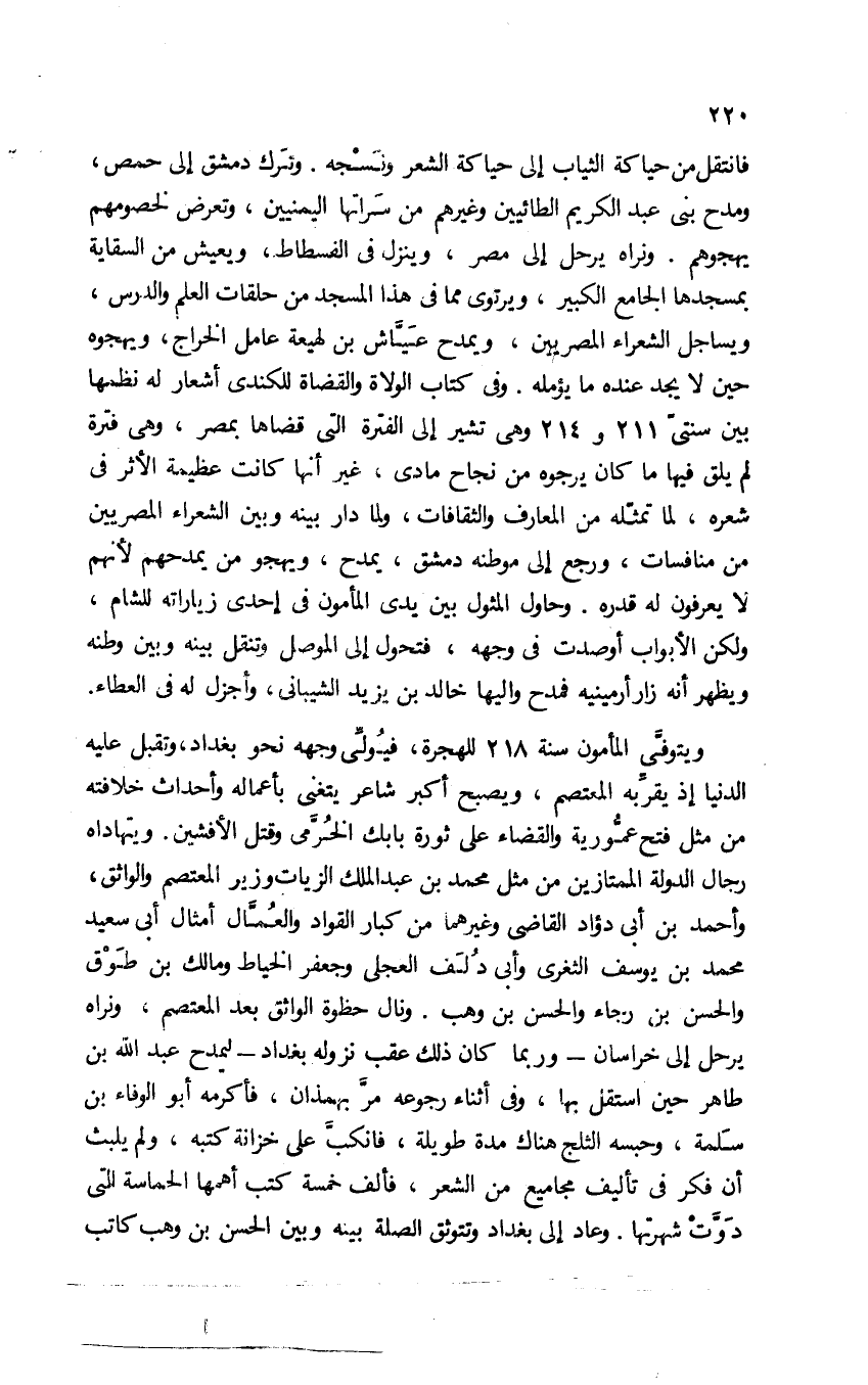 فانتقل من حياكة الثياب إلى حياكة الشعر ونسجه، وترك دمشق إلى حمص، ومدح بني عبد الكريم الطائيين وغيرهم من سراتها اليمنيين، وتعرض لخصومهم يهجوهم. ونراه يرحل إلى مصر، وينزل في الفسطاط، ويعيش من السقاية بمسجدها الجامع الكبير، ويرتوي ما في هذا المسجد من حلقات العلم والدرس، ويساجل الشعراء المصريين، ويمدح عَيَّاش بن لهيعة عامل الخراج، ويهجوه حين لا يجد عنده ما يؤمله. وفي كتاب الولاة والقضاة للكندي أشعار له نظمها بين سنتي 211و 214 وهي تشير إلى الفترة التي قضاها بمصر، وهي فترة لم يلق فيها ما كان يرجوه من نجاح مادي؛ غير أنها كانت عظيمة الأثر في شعره، لما تمثله من المعارف والثقافات، ولما دار بينه وبين الشعراء المصريين من منافسات، ورجع إلى موطنه دمشق يمدح، ويهجو من يمدحهم؛ لأنهم لا يعرفون له قدره. وحاول المثول بين يدي المأمون في إحدى زياراته للشام، ولكن الأبواب أوصدت في وجهه، فتحول إلى الموصل وتنقل بينه وبين وطنه ويظهر أنه زار أرمينية فمدح واليها خالد بن يزيد الشيباني، وأجزل له في العطاء.