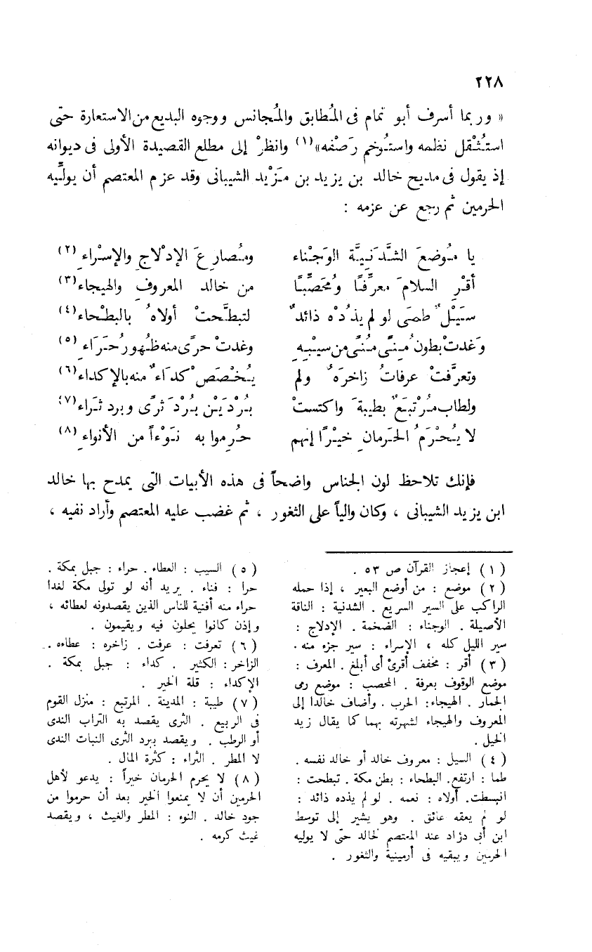 4 السيل: معروف خالد أو خالد نفسه. طما: ارتفع. البطحاء: بطن مكة. تبطحت: انبسطت. أولاه: نعمه. لو لم يذده ذائد: لو لم يَعُقْهُ عائق. وهو يشير إلى توسط ابن أبي دؤاد عند المعتصم لخالد حتى لا يوليه الحرمين ويبقيه في أرمينية والثغور.